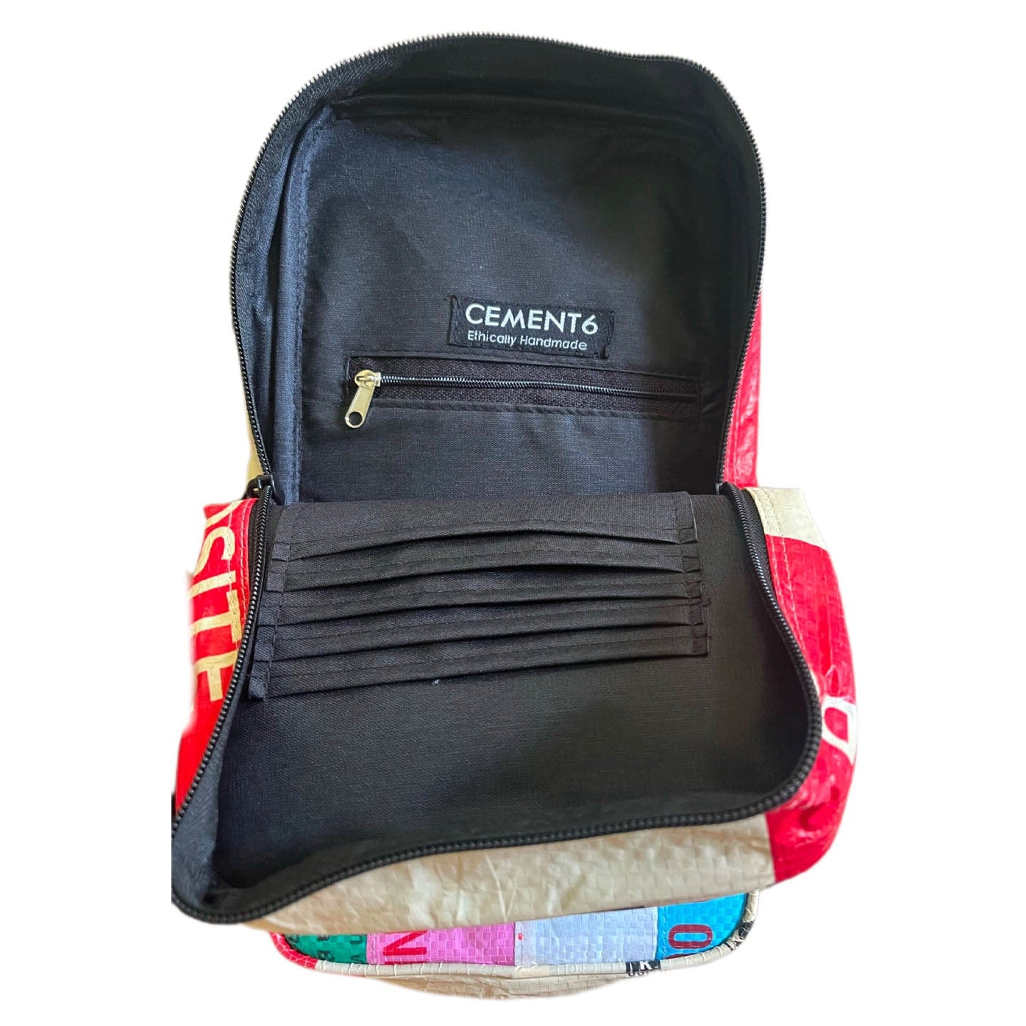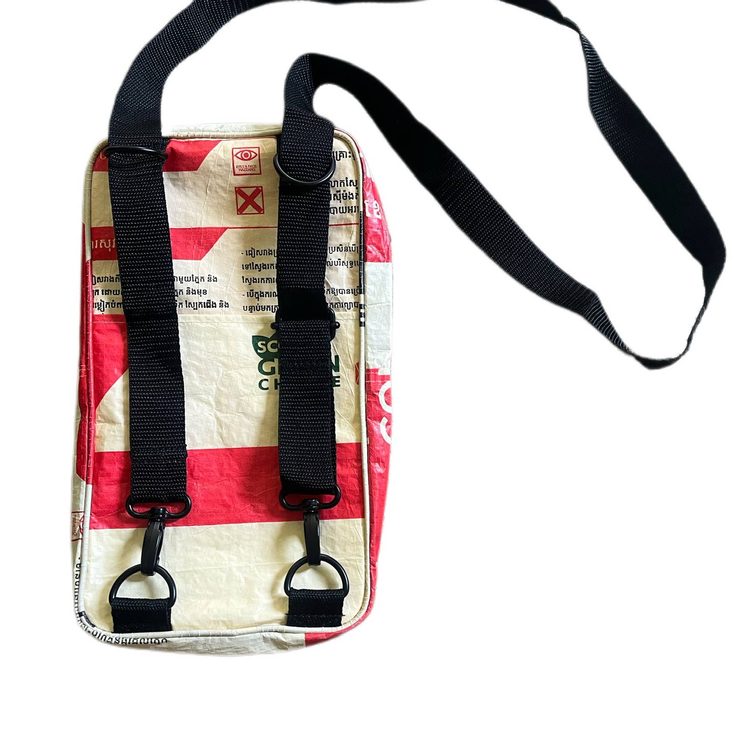 This bag is made from upcycled cement and animal feed bags that would have otherwise ended up in a landfill. They have lived a full life prior to their transformation. Each item is one of a kind, so coloring & pattern placement may vary. Imperfections should be celebrated. The material is water resistant & durable. We recommend hand washing & air drying. Items will soften & slightly fade with time and constant wear, giving it a unique, well-loved look. It is rare but possible for transfer of coloring to take place.
