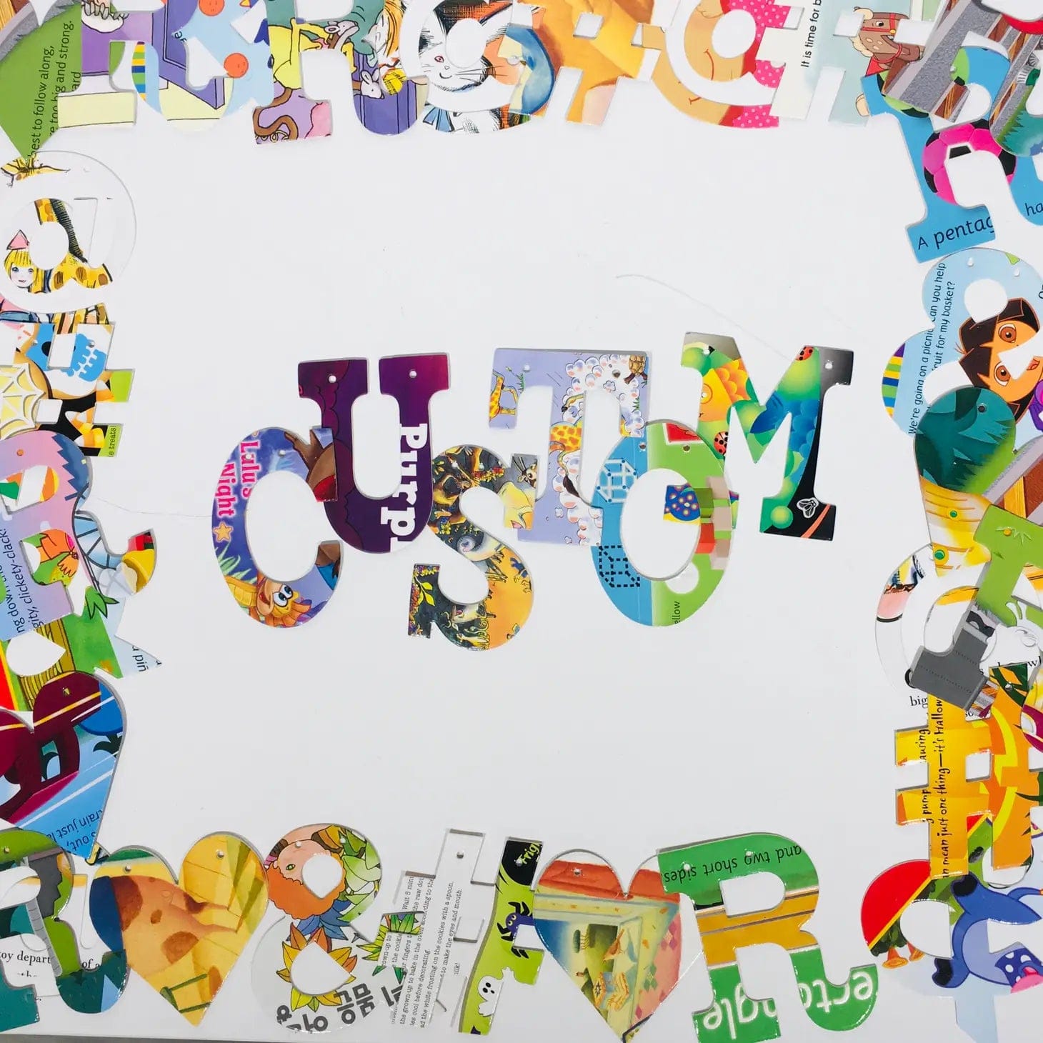 These letters are sustainably handmade from the sturdy and colorful pages of baby board books. Give us any name or a message, and we'll create a custom kit for you! Made with materials diverted from the landfill, each kit includes all of the pre-punched and brightly colored four-inch-tall letters needed for your name/message, along with enough string to create your own one-of-a-kind Baby Board Book Garland!