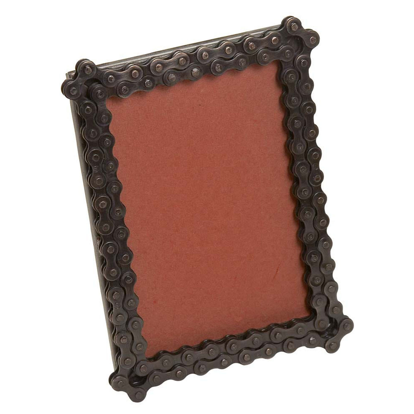 The perfect gift for your favorite (re)cyclist. This 4" x 6" frame is made in India with real recycled bicycle chains. Glass protects your photo while the stand and two hanging rings allow you to display your picture either vertically or horizontally.