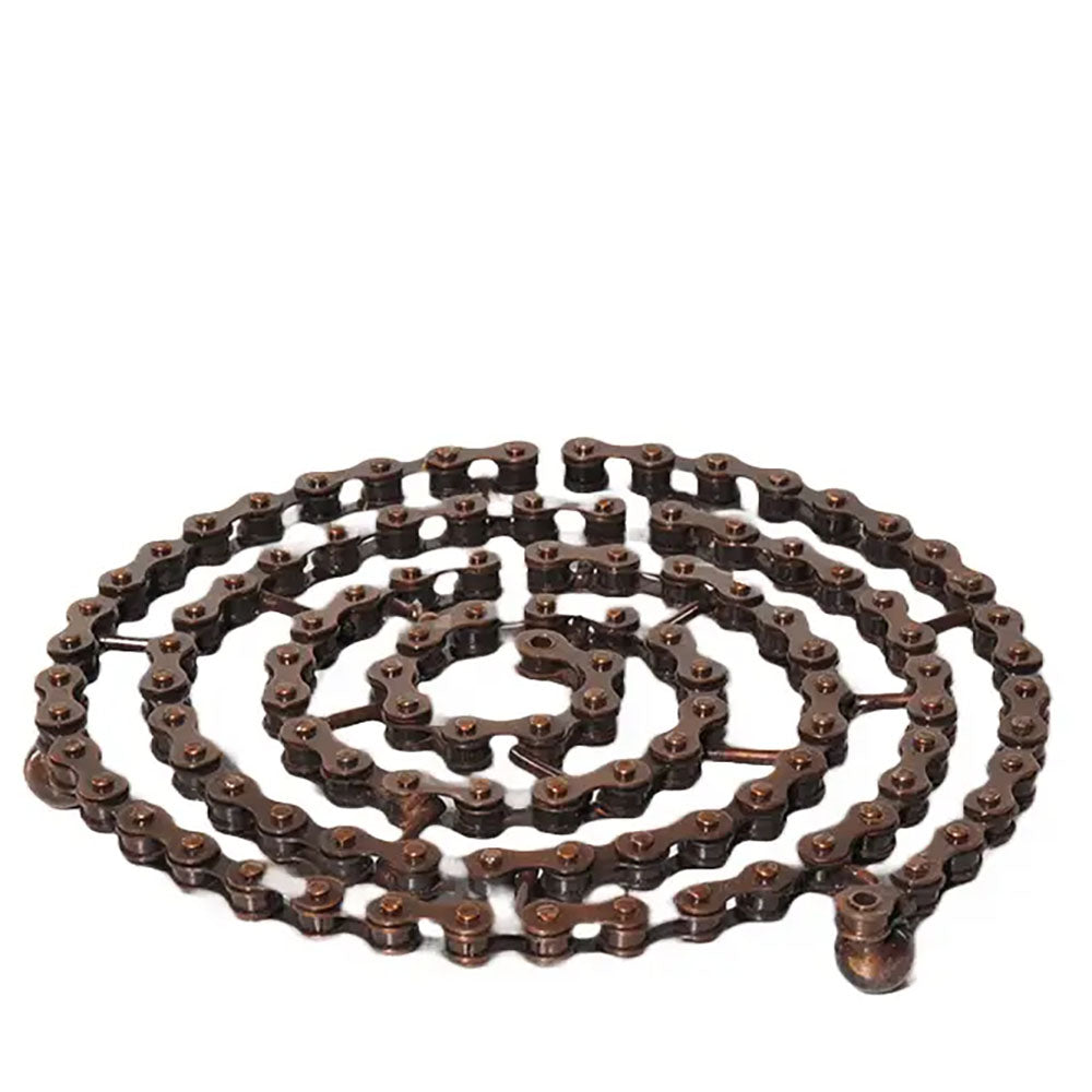 Give your table a little gear with this striking trivet made from recycled bicycle chain. Featuring a warm copper finish, it’s a perfect blend of function and industrial charm—ideal for hot pots, pans, or just sparking conversation. Each piece is handcrafted by artisans through Hopes Unlimited’s Fair Trade partner in India, transforming used bike chains into something unexpectedly elegant.