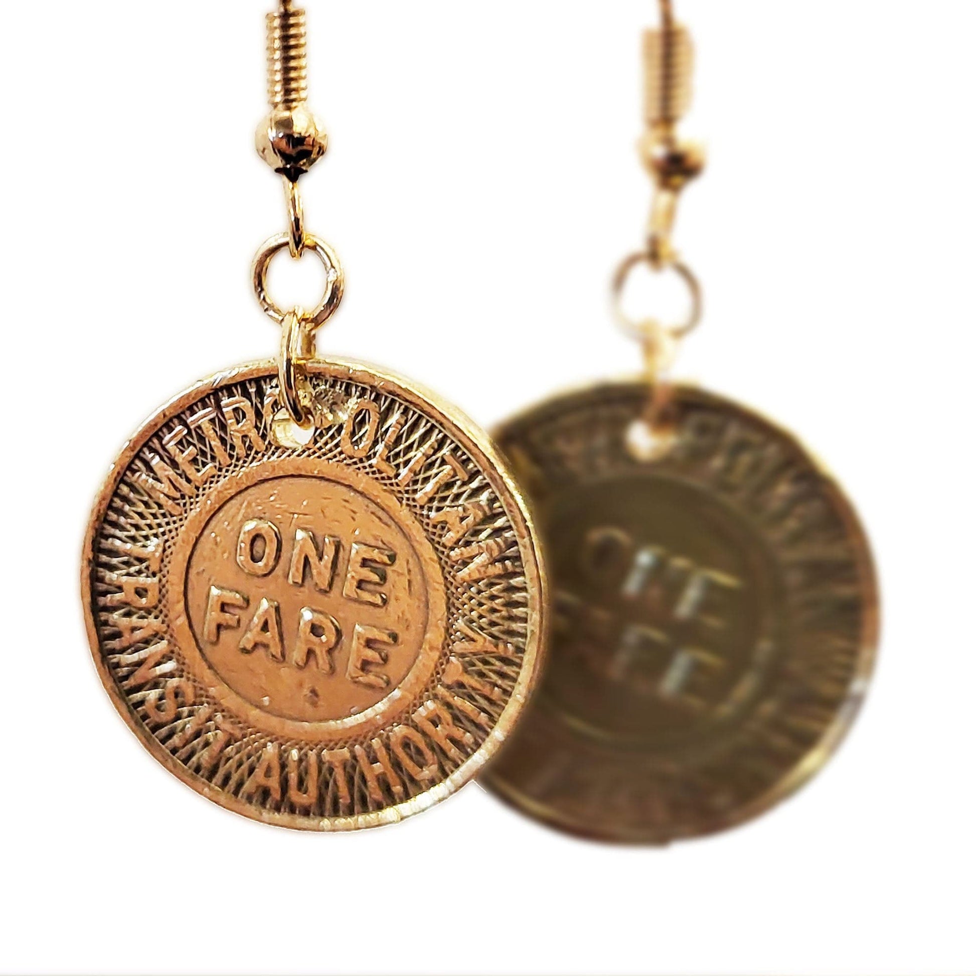 Long before we swiped or tapped cards to get on the subway, we paid fares by dropping tokens in turnstiles. These earrings are made from genuine tokens used for Boston's transit system, known as "The T." Each token measures just over ¾" wide—just a bit larger than a U.S. Penny.