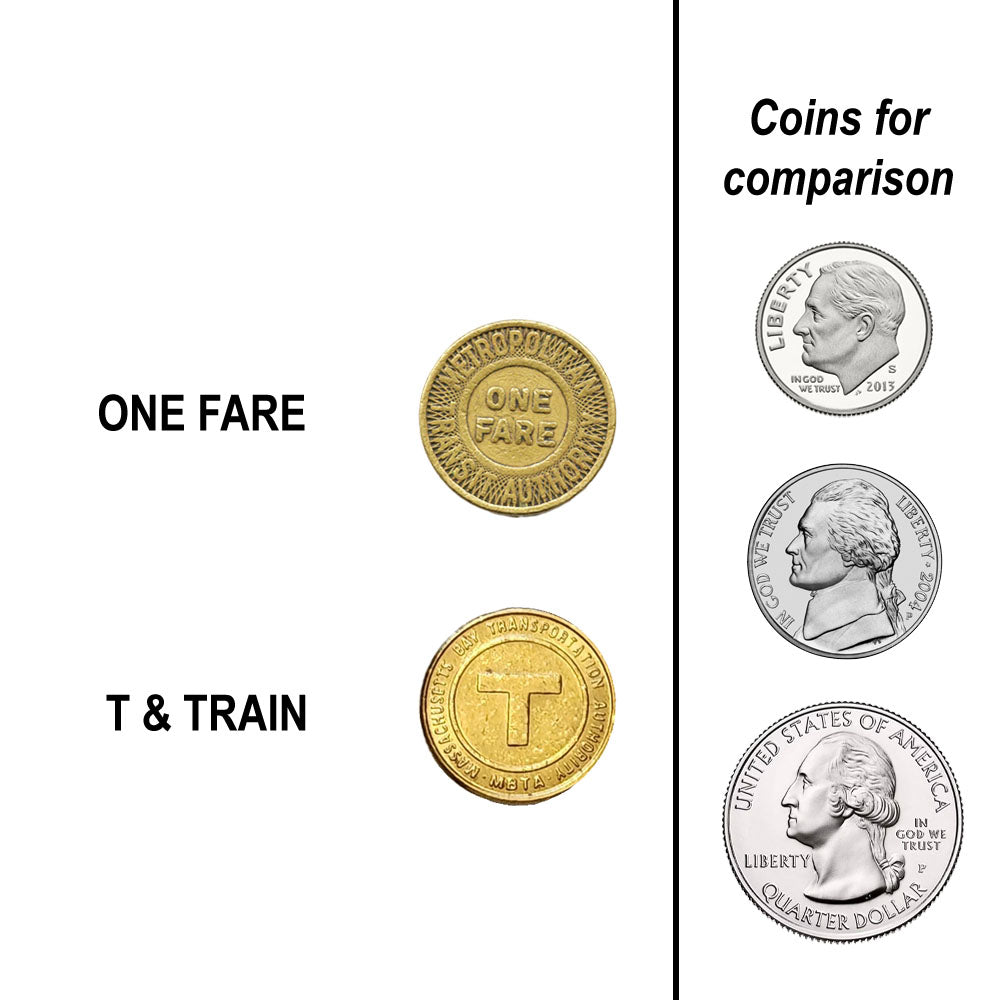 The token we labeled as ONE FARE is from long before Boston's subway was even called "The T." When this design was introduced in 1951, the underground in Boston was part of the MTA—of "Charlie on the MTA" fame—or Metropolitan Transit Authority. These are occasionally incorrectly thought to be tokens for the New York MTA. This version is the same on both sides.
