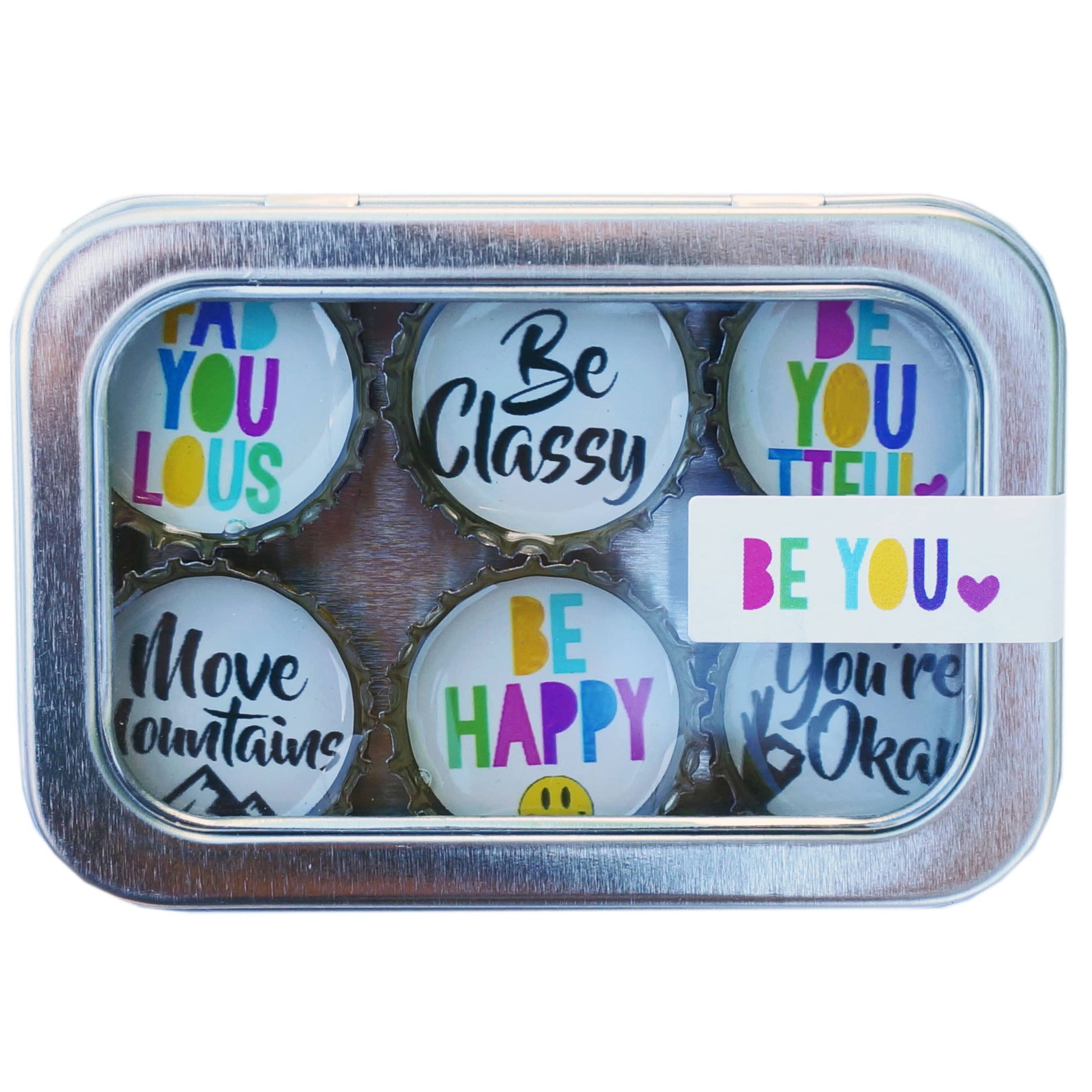These six-pack sets of themed magnets are handmade in the USA from recycled bottle caps. Kate's Magnets pours eco-conscious epoxy over the image creating a glassy finish. These magnetic expressions make fabulous and unique gifts and can be used in the kitchen, office, or on any magnetic surface. Each magnet set comes in the display tin (just like in the picture).
