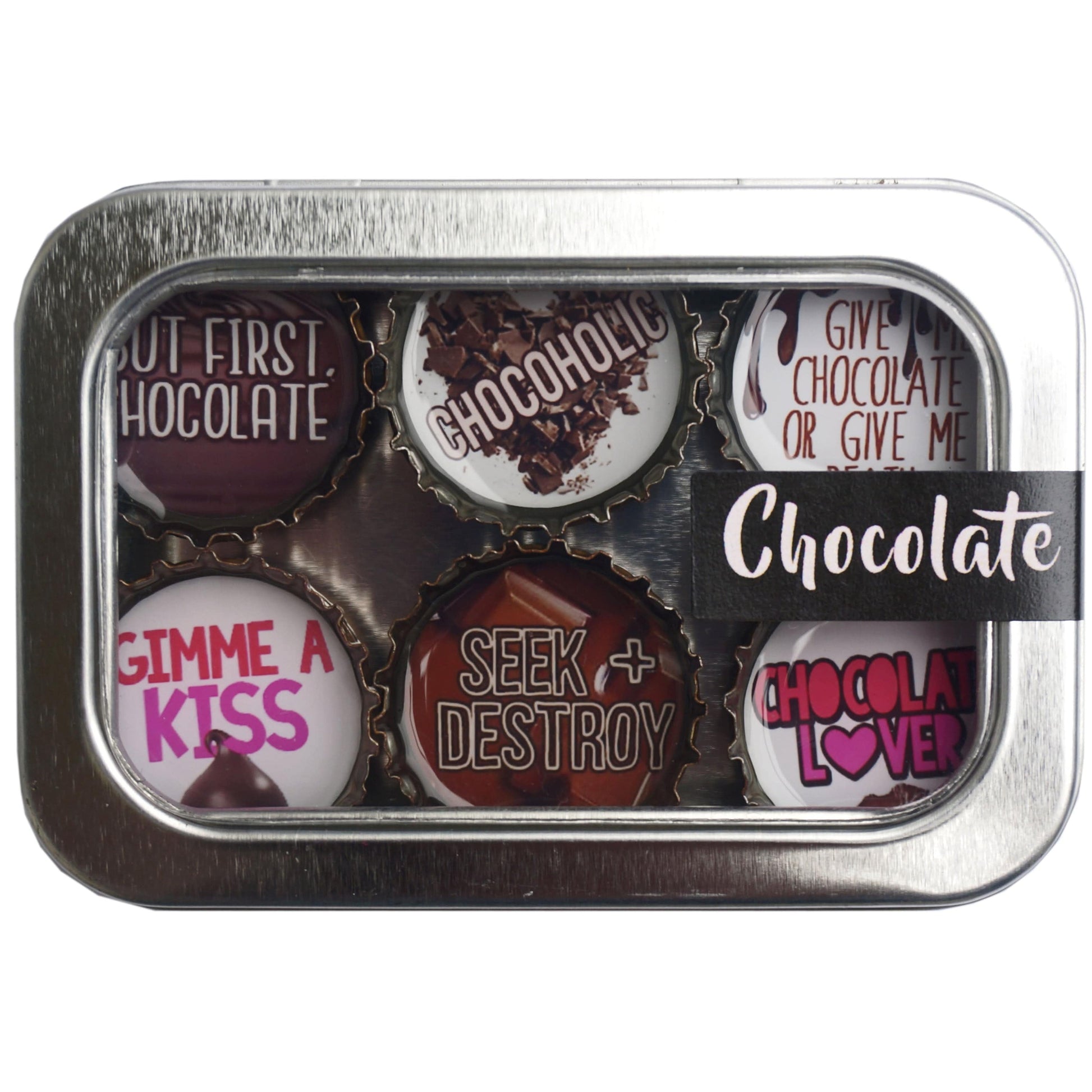 These six-pack sets of themed magnets are handmade in the USA from recycled bottle caps. Kate's Magnets pours eco-conscious epoxy over the image creating a glassy finish. These magnetic expressions make fabulous and unique gifts and can be used in the kitchen, office, or on any magnetic surface. Each magnet set comes in the display tin (just like in the picture).