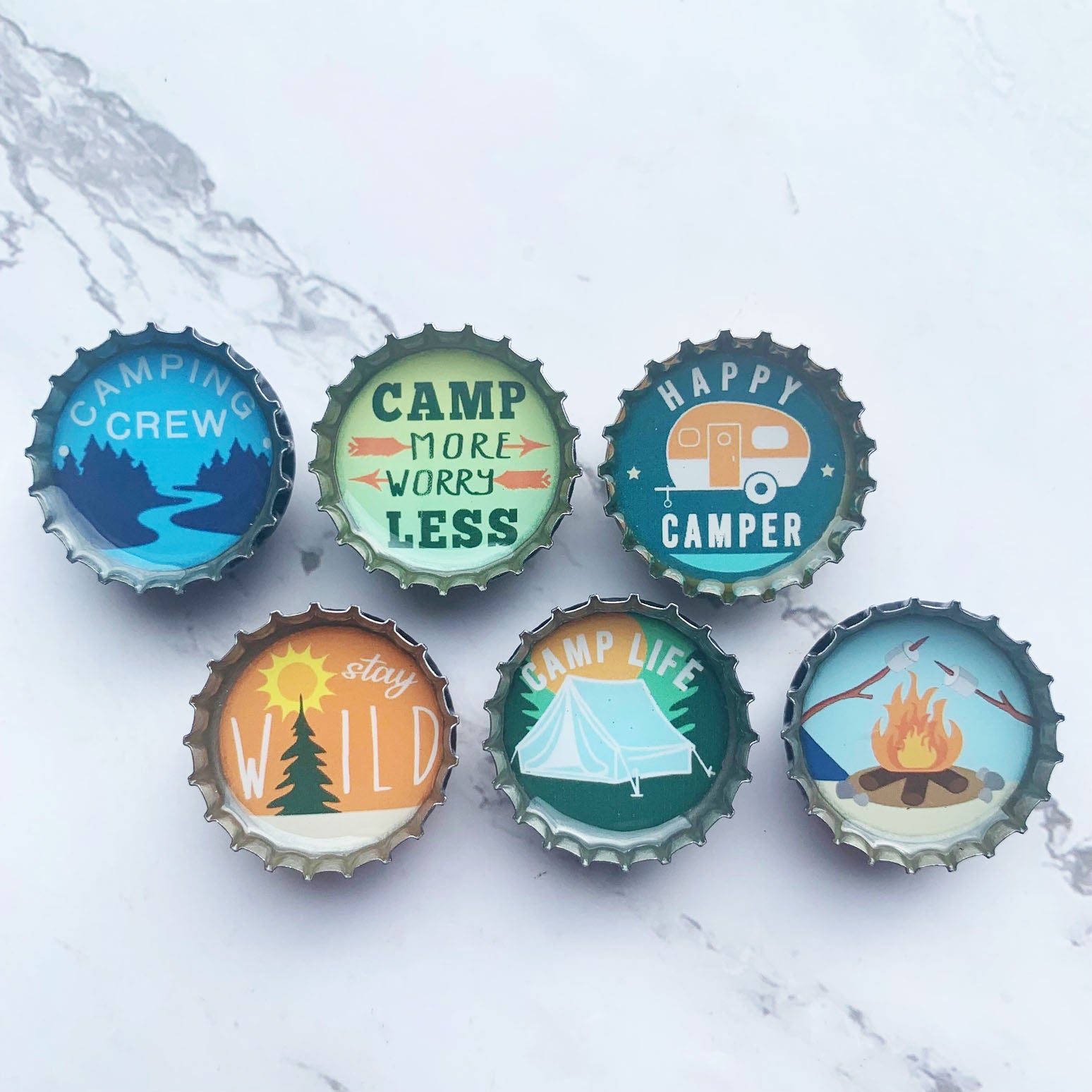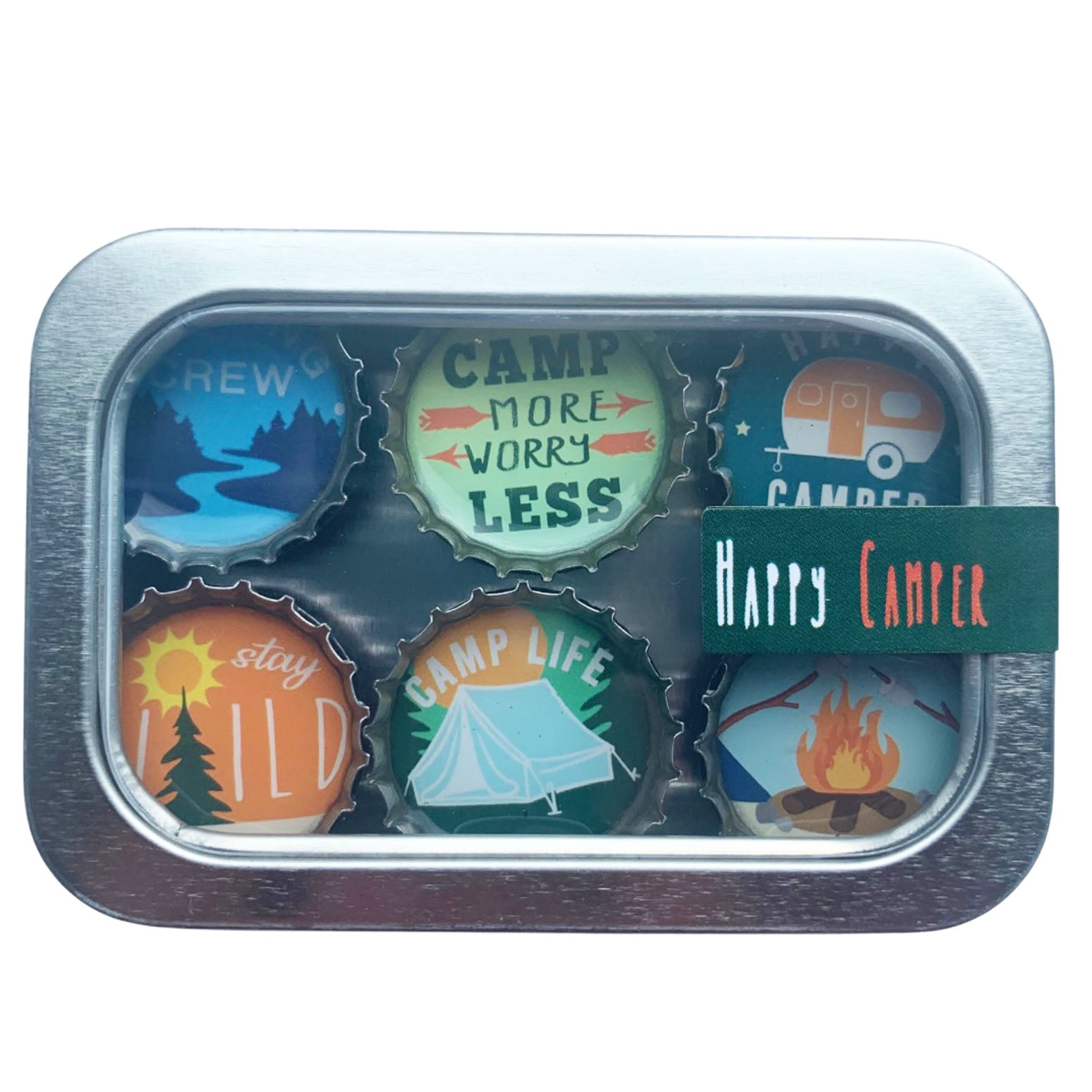 Celebrate camp life with this set of six magnets, handmade in the USA from recycled bottle caps. Kate's Magnets pours eco-conscious epoxy over the image creating a glassy finish. These magnetic expressions make fabulous and unique gifts and can be used in the kitchen, office, or on any magnetic surface. Each magnet set comes in the display tin (just like in the picture).