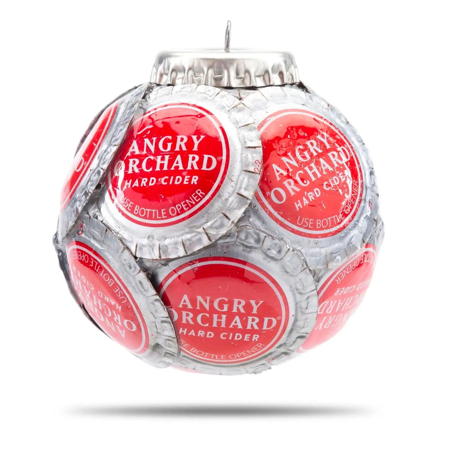 This ornament is created from Angry Orchard Hard Cider bottle caps. Each bottle cap is individually pressed and hammered to achieve just the right shape. The caps are bonded to each other to form the ornament so the inside is hollow. The finished product is more durable than a glass ornament.