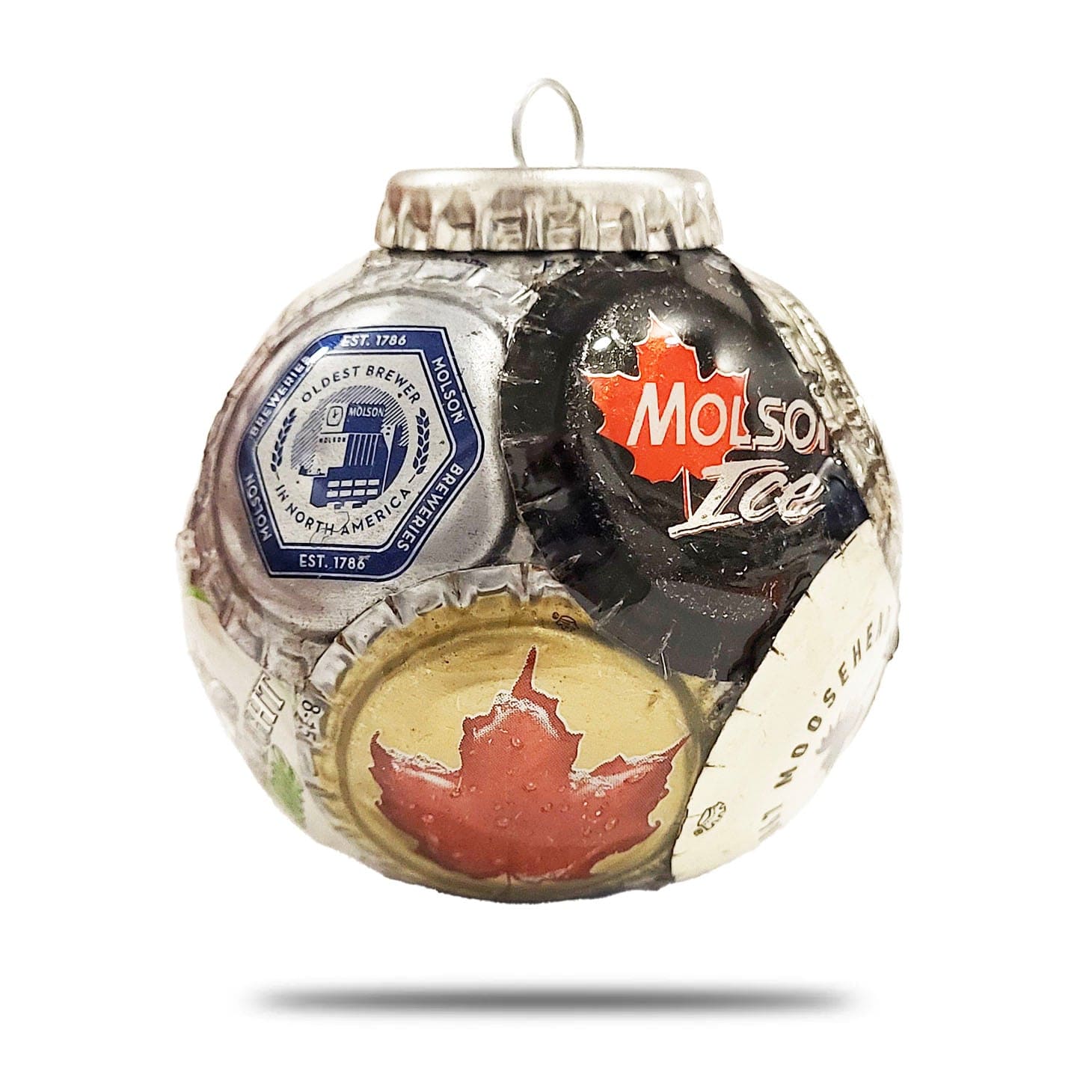 This ornament is created using bottle caps from Canadian beer brands. Each bottle cap is individually pressed and hammered to achieve just the right shape. The caps are bonded to each other to form the ornament so the inside is hollow. The finished product is more durable than a glass ornament.