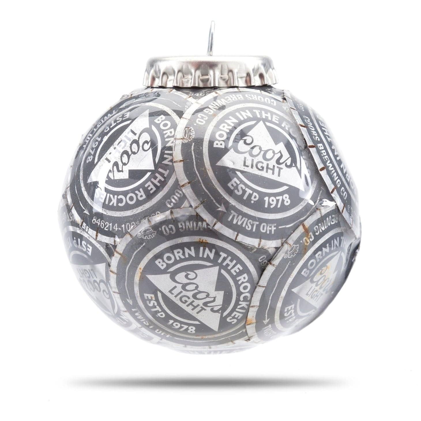 This ornament is created from Coors Light bottle caps. Each bottle cap is individually pressed and hammered to achieve just the right shape. The caps are bonded to each other to form the ornament so the inside is hollow. The finished product is more durable than a glass ornament.