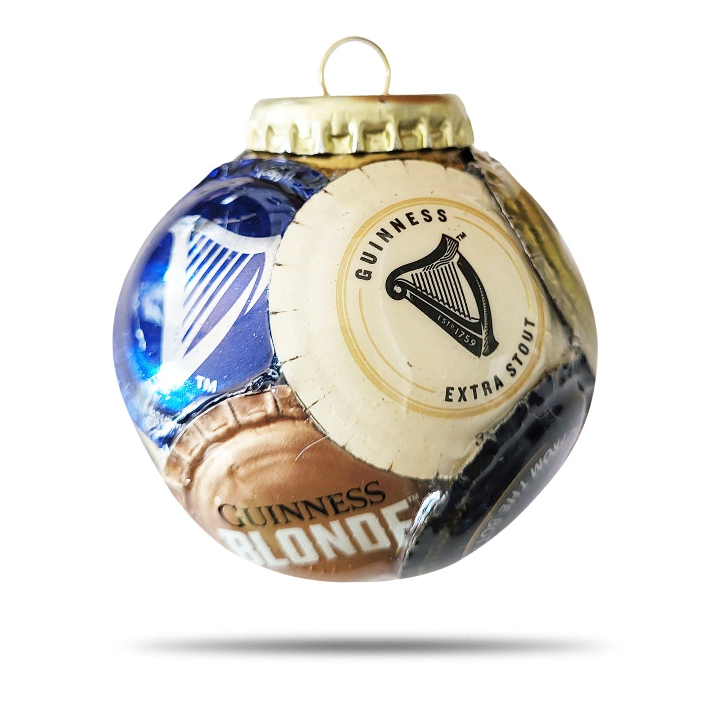 This ornament is created from assorted Guinness bottle caps. Each bottle cap is individually pressed and hammered to achieve just the right shape. The caps are bonded to each other to form the ornament so the inside is hollow. The finished product is more durable than a glass ornament.