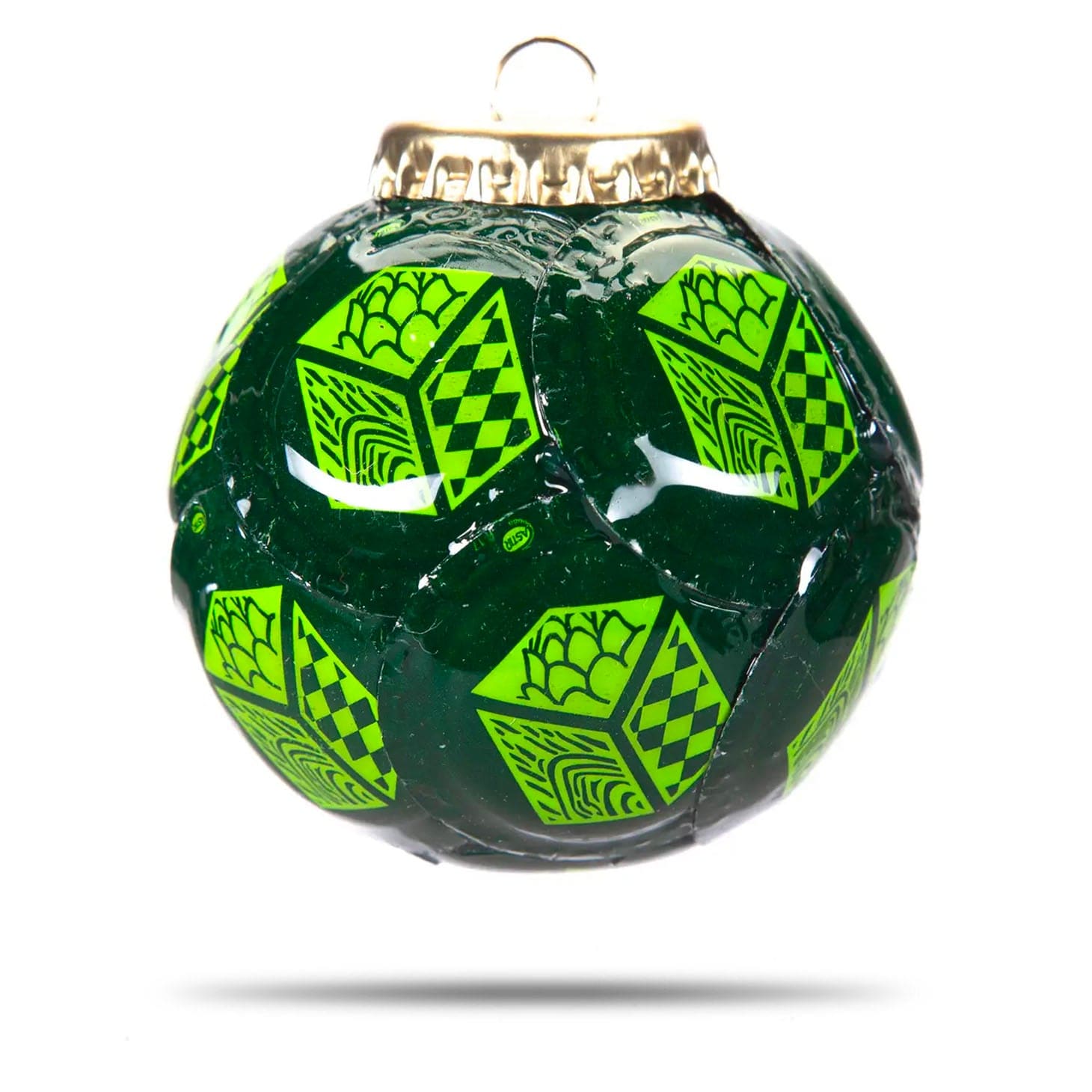 This ornament is created from Jack's Abby Craft Lager bottle caps. Each bottle cap is individually pressed and hammered to achieve just the right shape. The caps are bonded to each other to form the ornament so the inside is hollow. The finished product is more durable than a glass ornament.