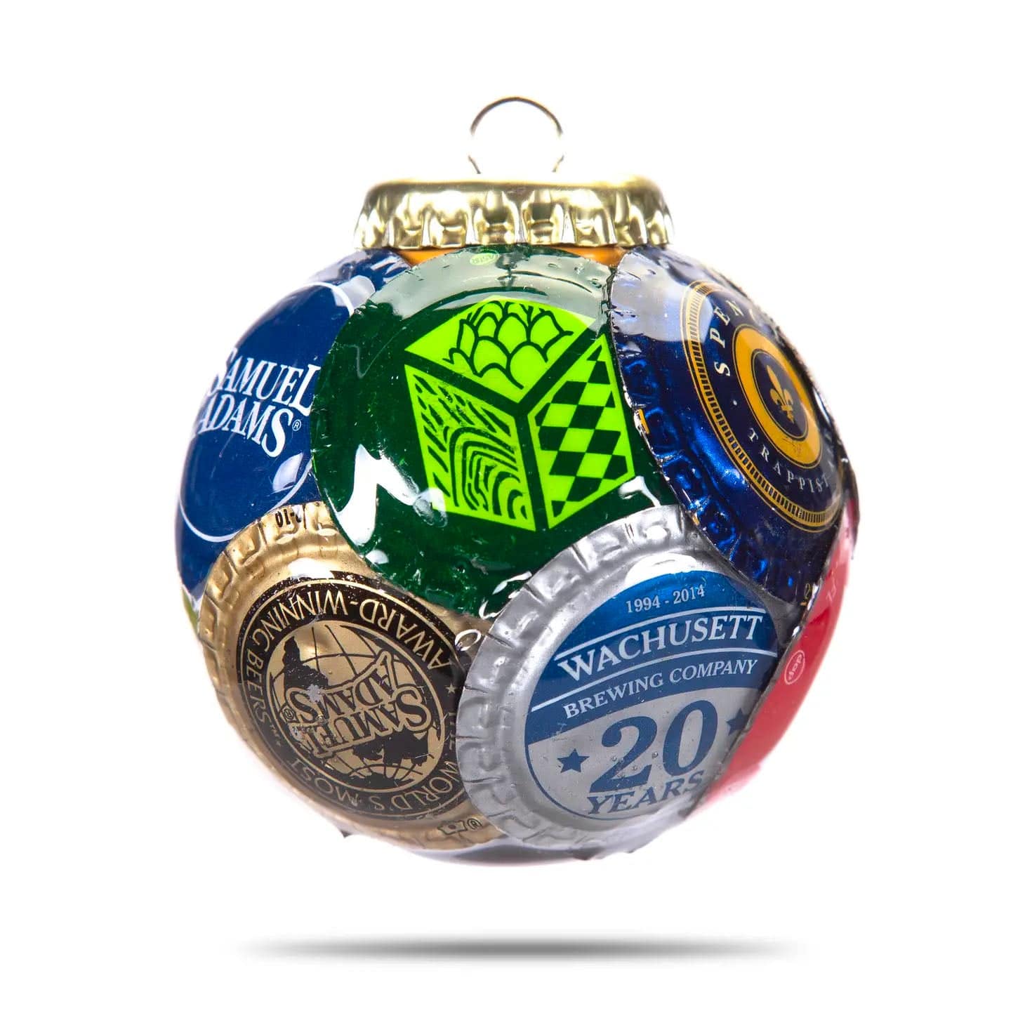 This ornament is created from bottle caps from various Massachusetts breweries. Each bottle cap is individually pressed and hammered to achieve just the right shape. The caps are bonded to each other to form the ornament so the inside is hollow. The finished product is more durable than a glass ornament.