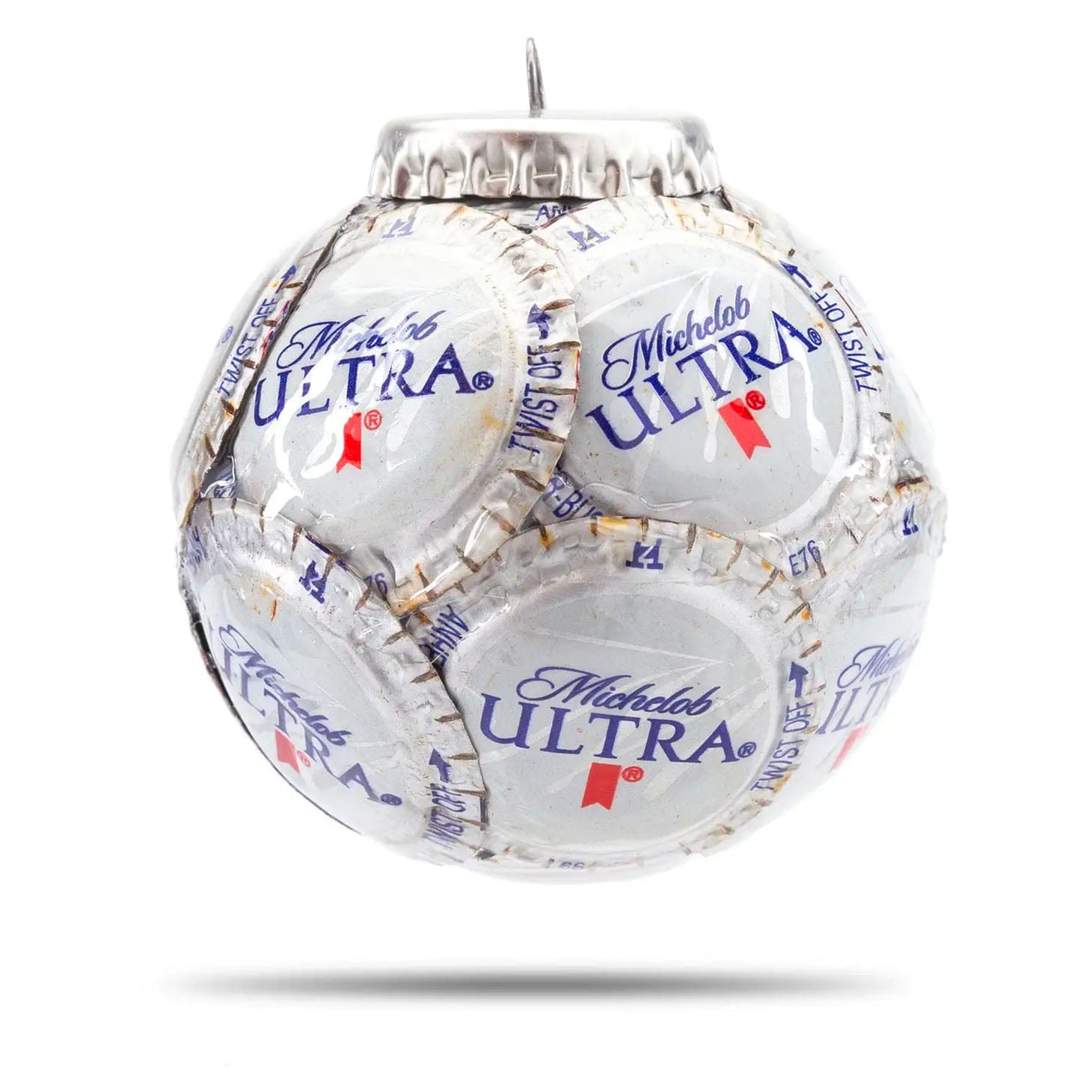 This ornament is created from Michelob Ultra beer bootle caps. Each bottle cap is individually pressed and hammered to achieve just the right shape. The caps are bonded to each other to form the ornament so the inside is hollow. The finished product is more durable than a glass ornament.