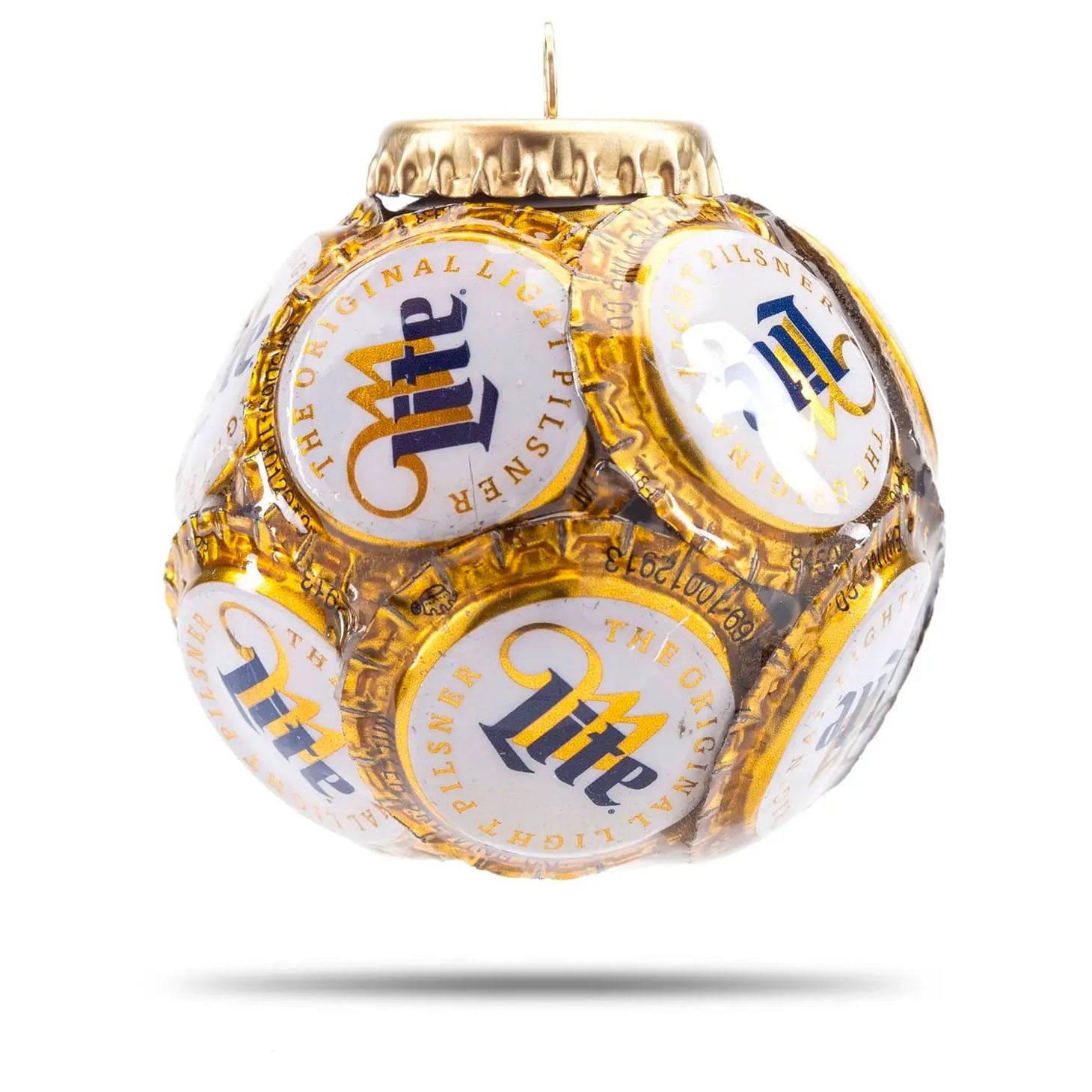 This ornament is created from Miller Lite beer bootle caps. Each bottle cap is individually pressed and hammered to achieve just the right shape. The caps are bonded to each other to form the ornament so the inside is hollow. The finished product is more durable than a glass ornament.