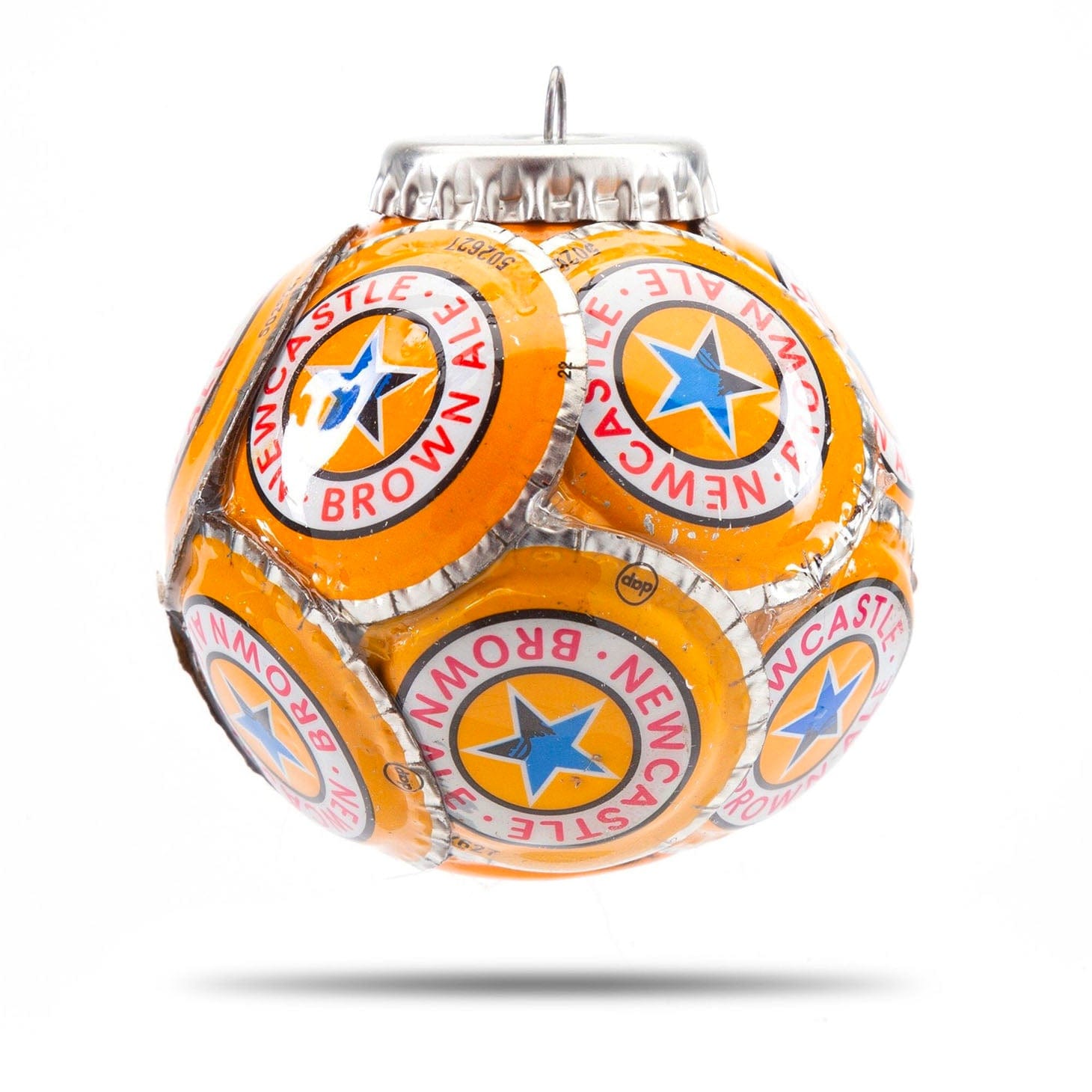 This ornament is created from Newcastle Brown Ale bottle caps. Each bottle cap is individually pressed and hammered to achieve just the right shape. The caps are bonded to each other to form the ornament so the inside is hollow. The finished product is more durable than a glass ornament.
