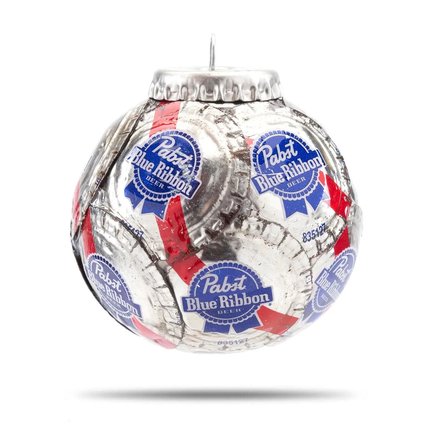 Not part of our original order, we received requests from customers asking us to carry this ornament, made from PBR bottle caps. Each bottle cap is individually pressed and hammered to achieve just the right shape. The caps are bonded to each other to form the ornament so the inside is hollow. The finished product is more durable than a glass ornament.