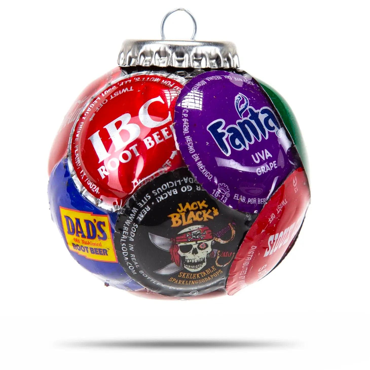 This ornament is created from the bottle caps from various popular soft drinks. Each bottle cap is individually pressed and hammered to achieve just the right shape. The caps are bonded to each other to form the ornament so the inside is hollow. The finished product is more durable than a glass ornament.