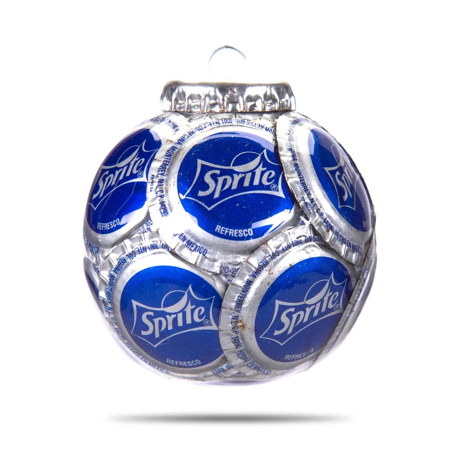 This ornament is created from Sprite bottle caps. Each bottle cap is individually pressed and hammered to achieve just the right shape. The caps are bonded to each other to form the ornament so the inside is hollow. The finished product is more durable than a glass ornament.