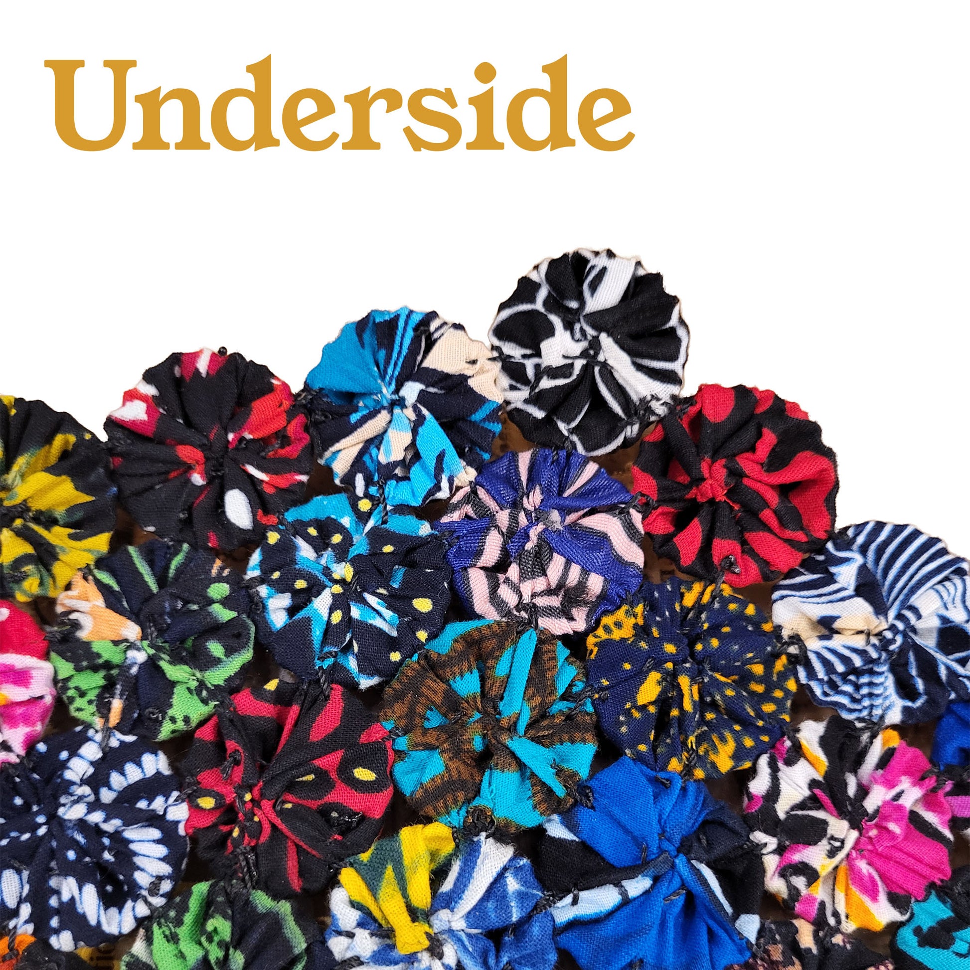 The smaller trivet is made using 19 caps and measures around 5.5" in diameter. The larger trivet is made using 61 caps and measures around 9" in diameter. The underside is unfinished, so you just see the gathered fabric.