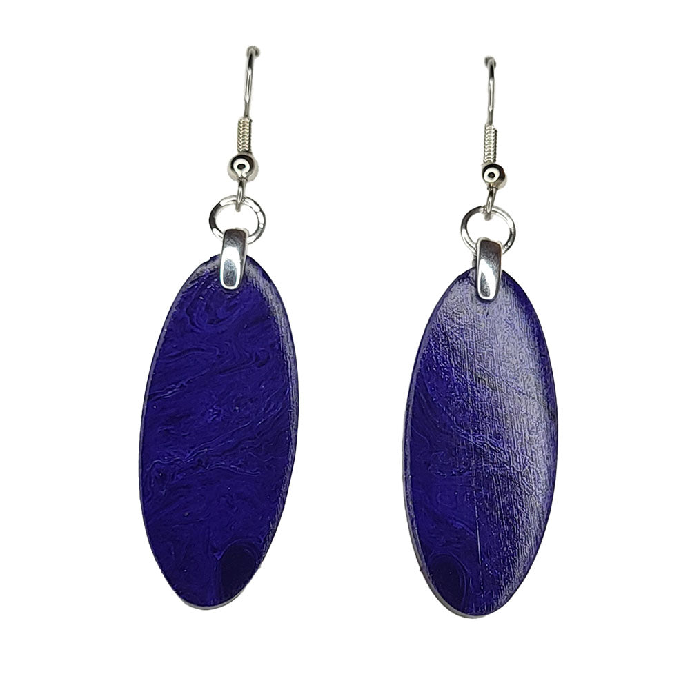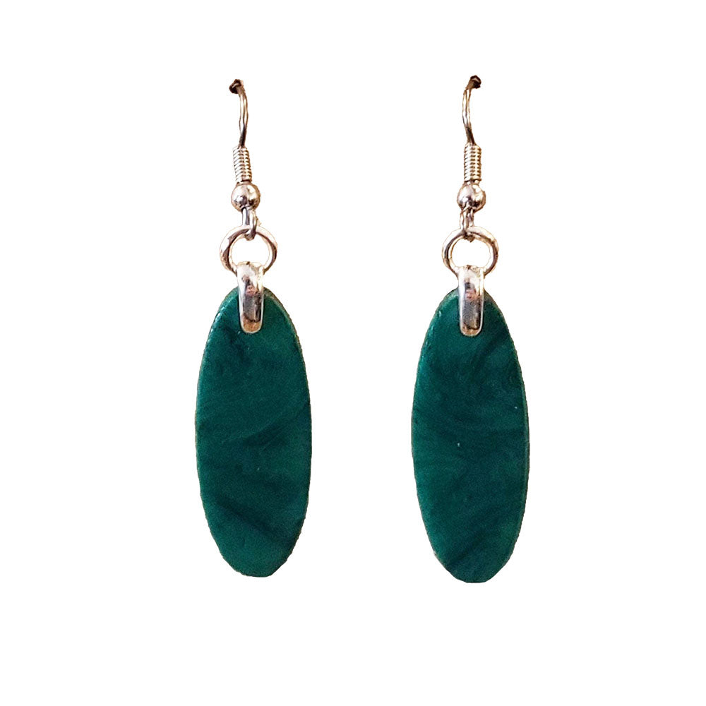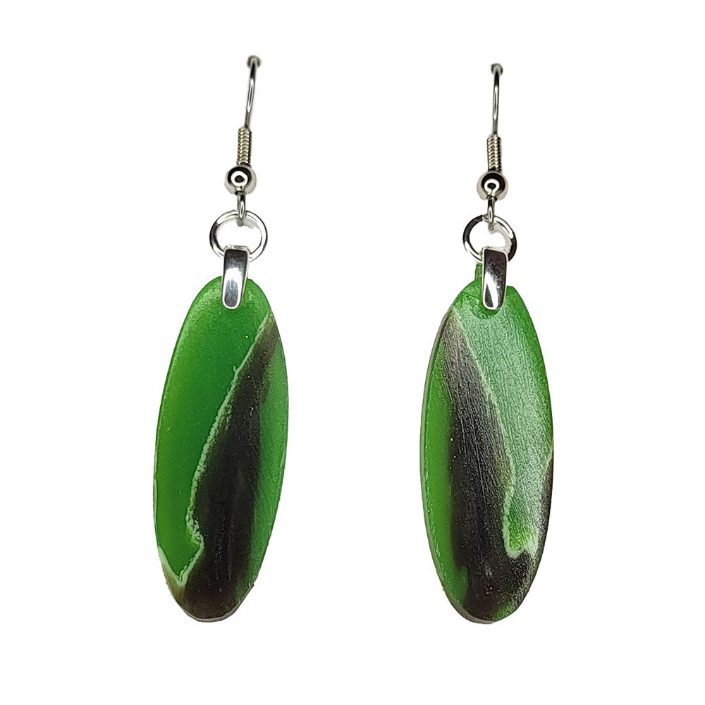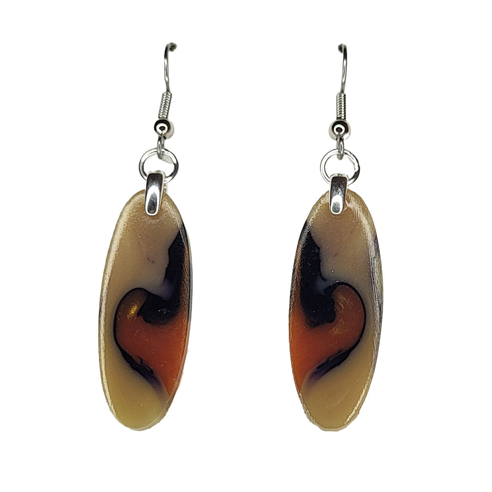 These beautiful earrings are handmade from Bowlerite, which is the name given to the outer shell of salvaged bowling balls. When the balls are retired, pieces of the outer layer are cut, shaped, and polished to a stone-like appearance. Bowlerite is even referenced on some gemological websites.