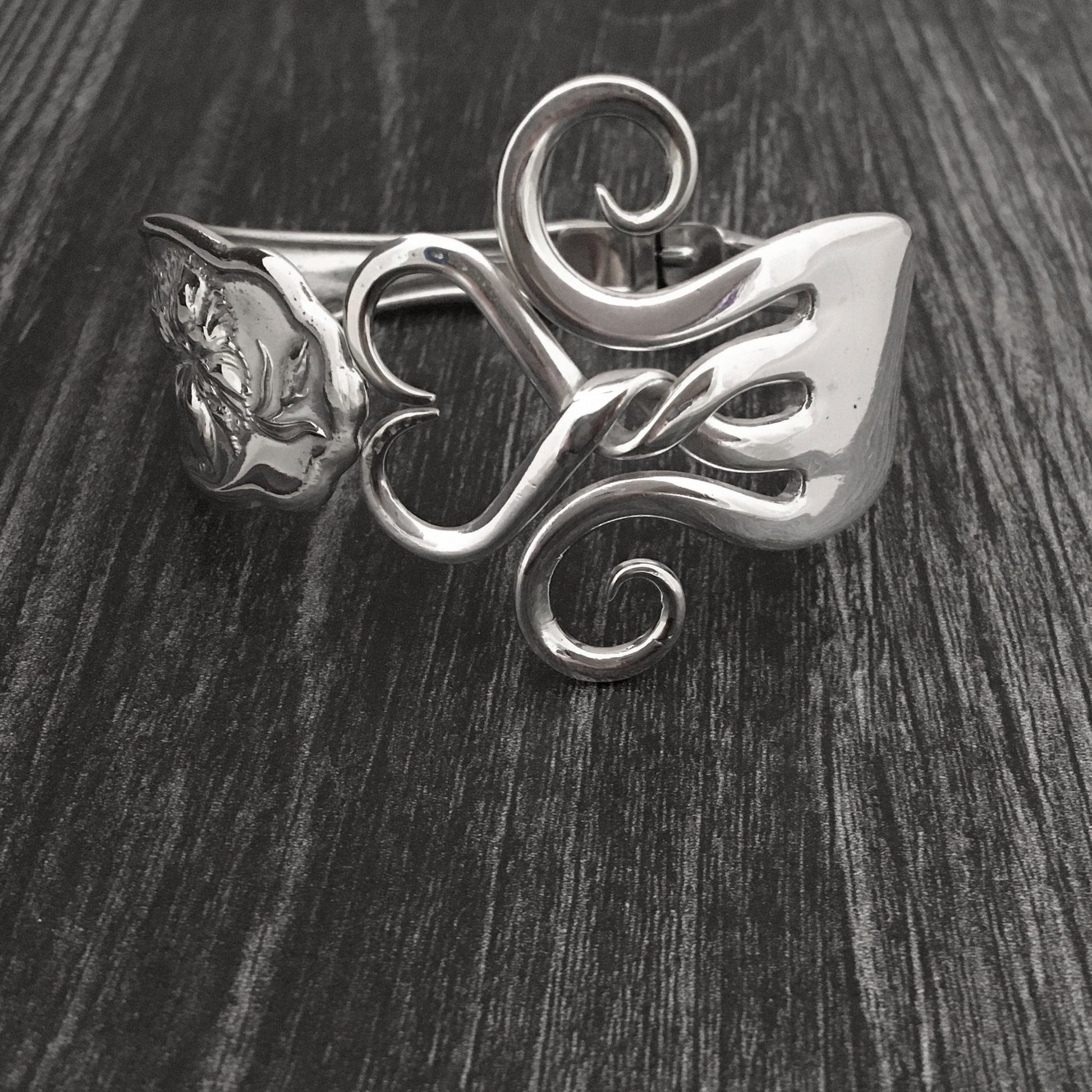 This fork bracelet was crafted by artist John Marchello and features a heart design from two tines that open up after being braided together. The outer tines spiral on the sides for an elegant finish. This bracelet has a spring hinge for easy wearing. Patterns on the handle of the fork vary.