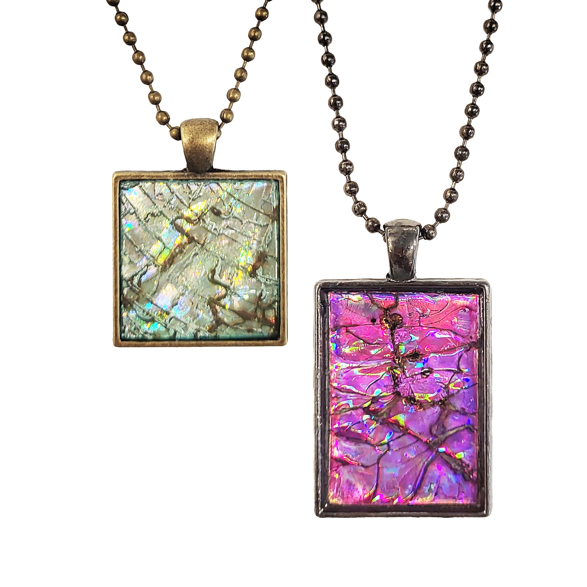 Each necklace is cut by hand into a square or rectangle, then paired with a colorful ball chain for a lightweight, eye-catching piece that brings new life to obsolete tech. No two are exactly alike, and that’s exactly the point.