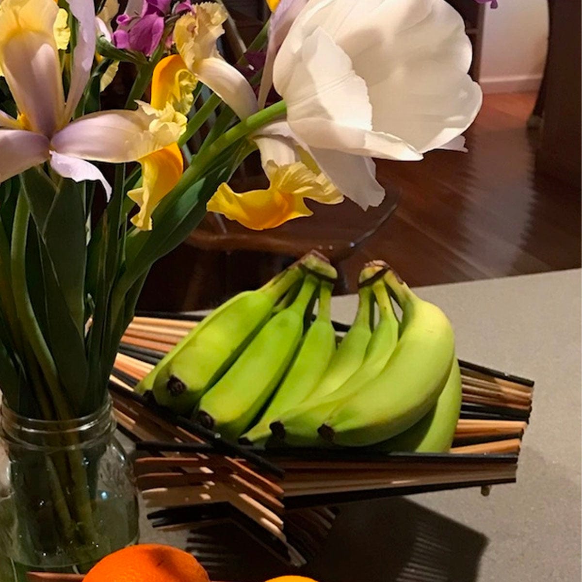 This basket is made using 20 pairs of single-use chopsticks and can hold around a six pieces of fruit, perfect for a bunch of bananas. All chopsticks are thoroughly sanitized before being assembled. Coloring is done with tea leaves, natural plant dyes, and food coloring. One of the coolest features is that they can be easily folded and stored when not in use! Wash with soap and water.