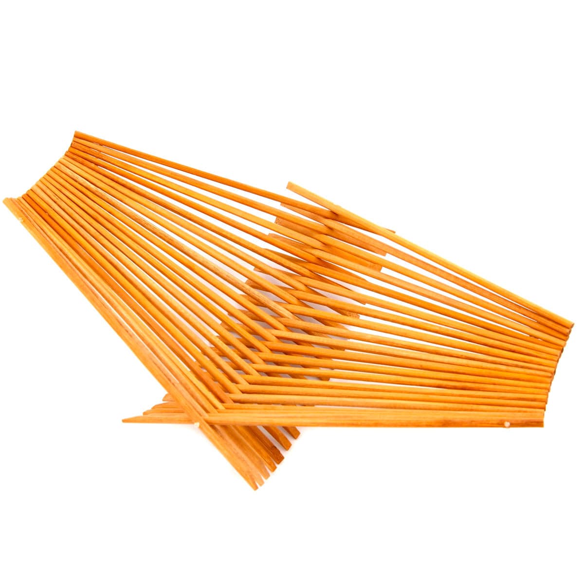 This basket is made using 20 pairs of single-use chopsticks and can hold around a six pieces of fruit, perfect for a bunch of bananas. All chopsticks are thoroughly sanitized before being assembled. Coloring is done with tea leaves, natural plant dyes, and food coloring. One of the coolest features is that they can be easily folded and stored when not in use! Wash with soap and water.