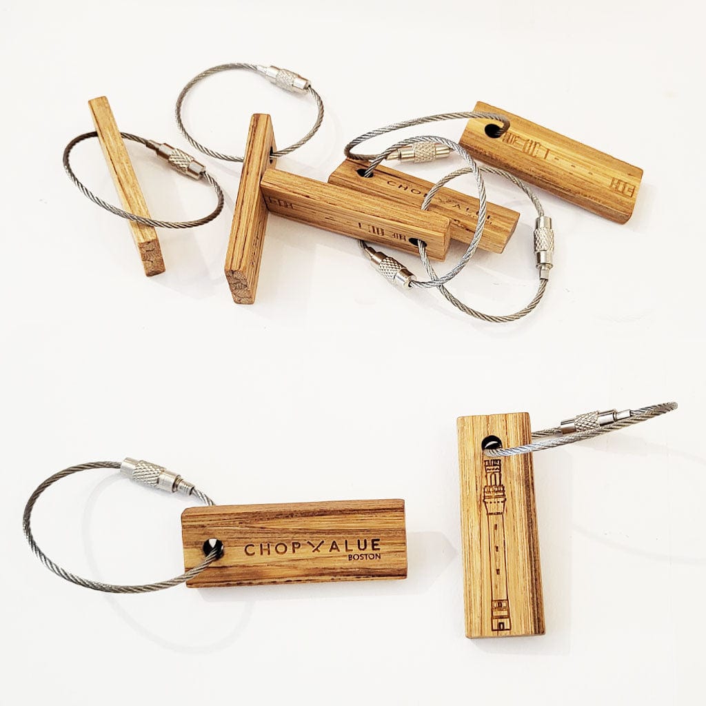 This Chopsticks Monument Keychain is an easily-pocketable 1.75" long and has a stainless steel wire loop. The Pilgrim Monument in Provincetown is on one side, while the ChopValue Boston logo is on the other. Use it for your keys, on your bag, or as a zipper pull. It's a cute little gift and conversation starter.