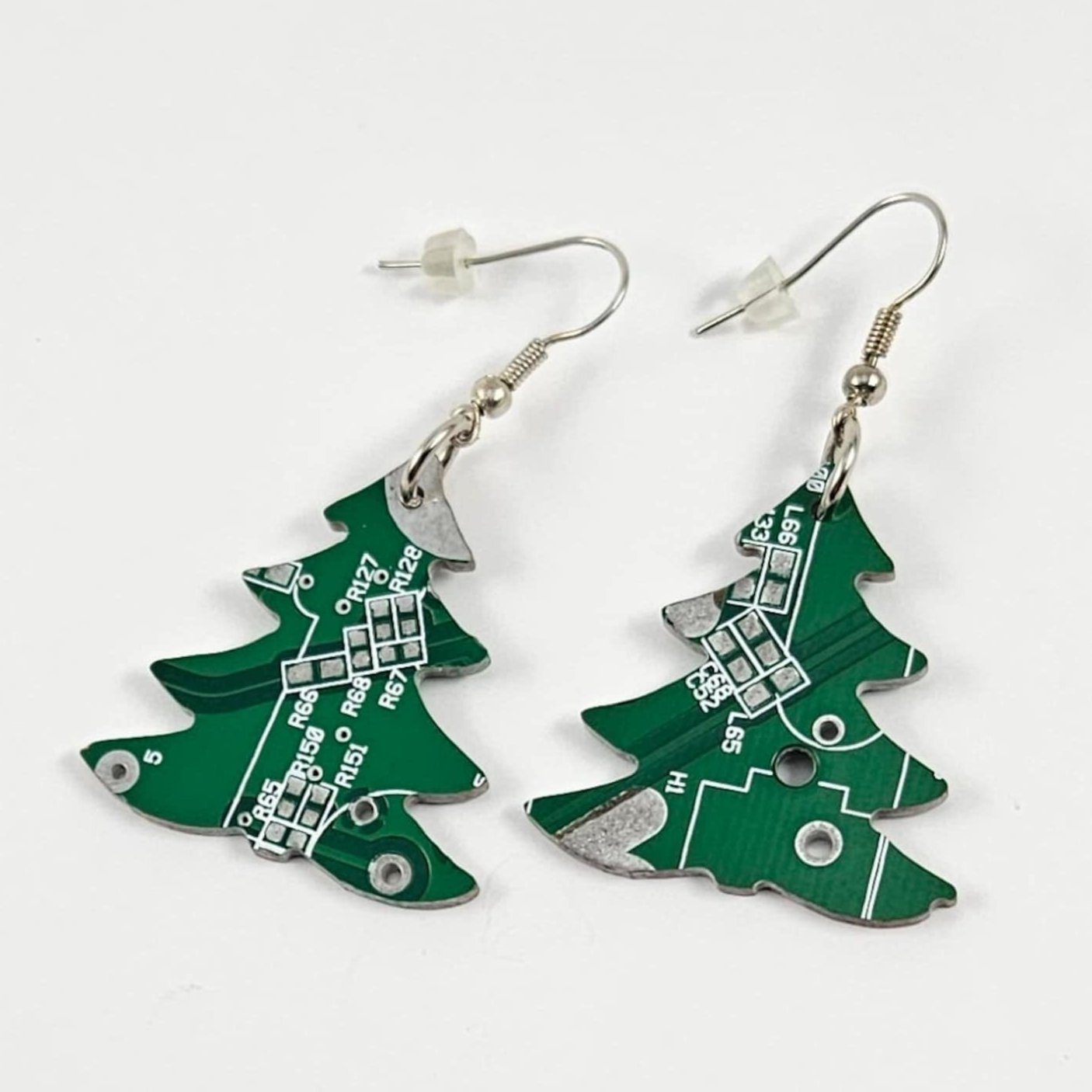 TechWears created the perfect holiday accessory for the techie in your life. Christmas Tree earrings created from recycled PCBs.