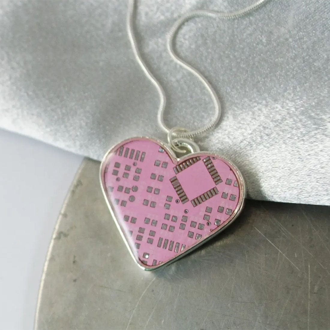 This Circuit Board Pink Heart Charm Necklace is the perfect blend of technology and tenderness! With a pink circuit board, cut to fit into the heart-shaped setting and covered in layers of protective, shiny resin, it's a unique accessory that will make any tech-lover's heart skip a beat! Comes with an 18" silver plated snake chain so you're ready to go in no time. Let the sparks fly!