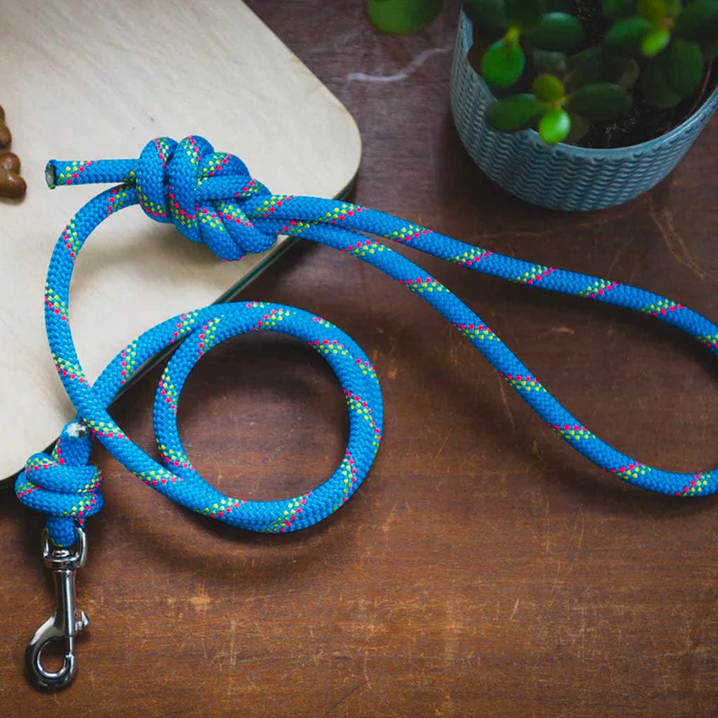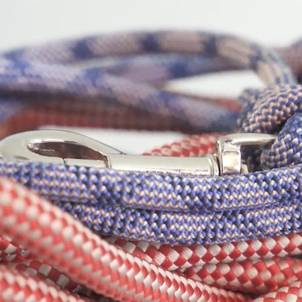 This leash is handmade in Sheffield, England, using retired British climbing rope with a figure 8 knot and a sold cast metal bolt snap hook. Climbing rope like this is strong enough to hold... well... really heavy stuff. (We can't get precise because there are different sizes of ropes and we're clueless.) Let's just say it's way past what your pooch can pull!