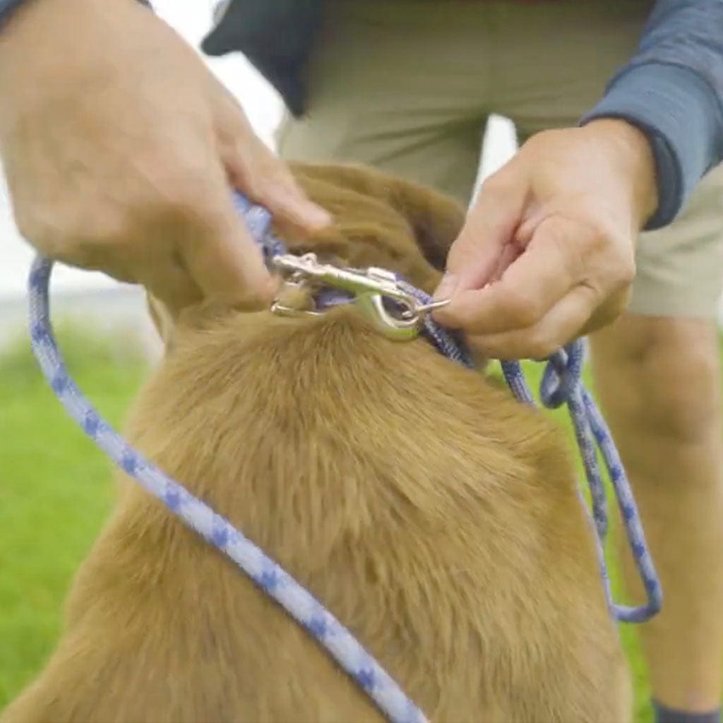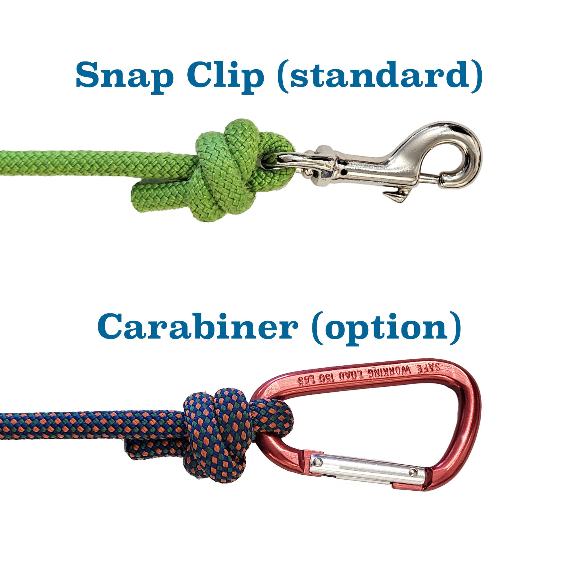 One dog parent customer told us she loves the leashes, but pointed out that the type of snap hook used for these leashes can stop functioning when it gets sand in it—and we have a lot of sand out here on the tip of Cape Cod. We took her concern seriously and purchased some upcycled aluminum carabiner-style clips. If you’d prefer one of those on your leash, just click the option above and we’ll swap it in. (Carabiners are random colors.)