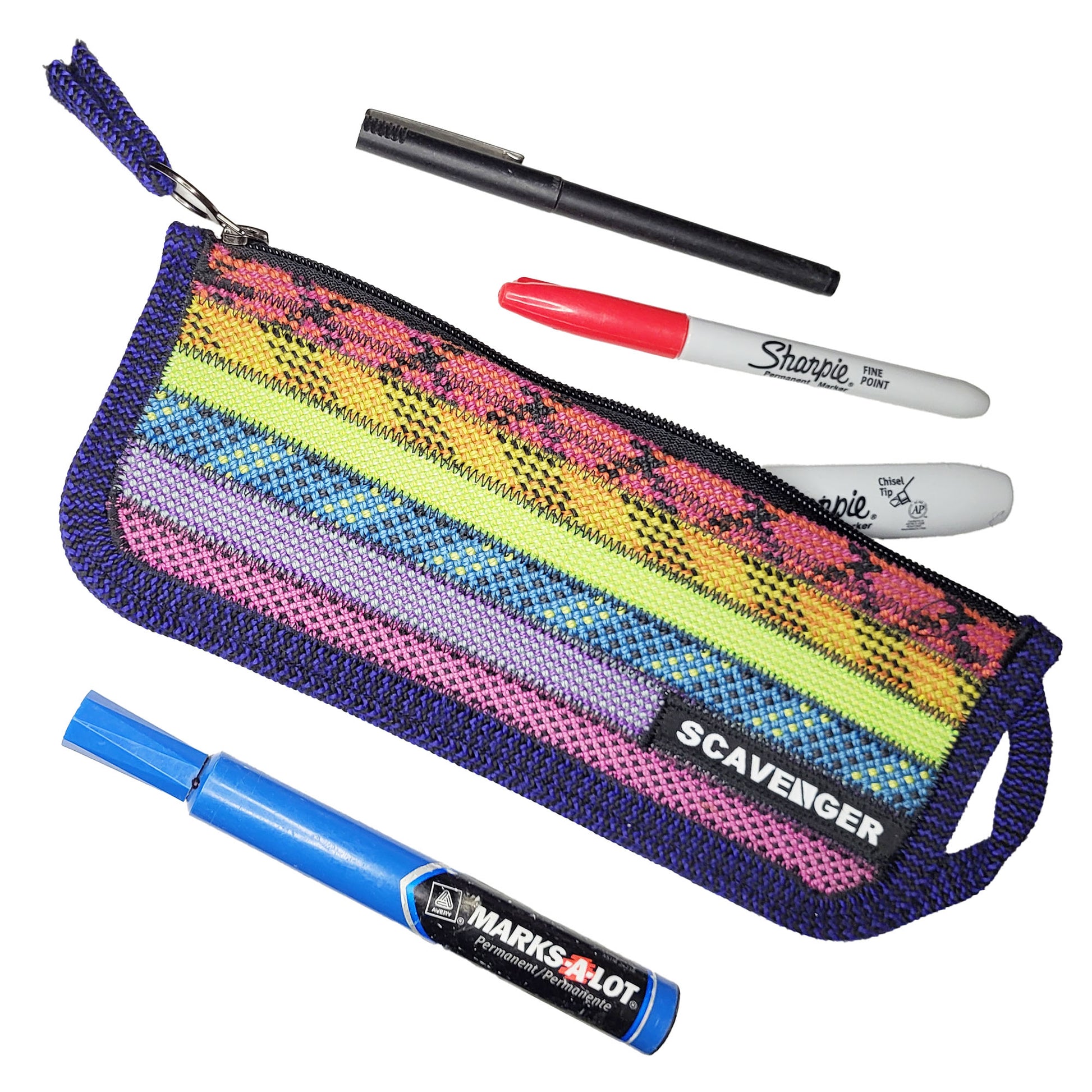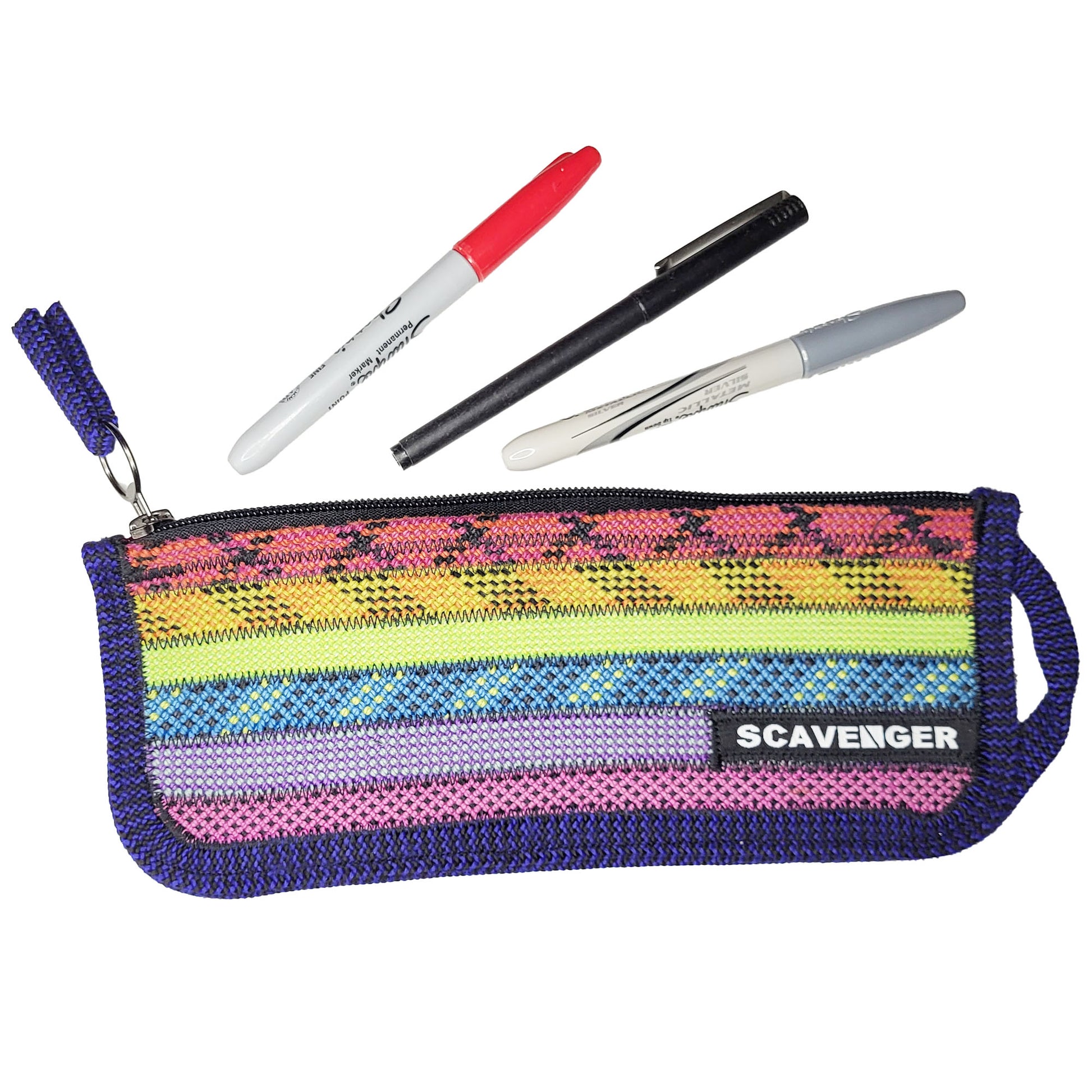 Measuring 9” x 3.5”, it’s the perfect size for more than just pencils—use it for makeup, tech accessories, a mini first aid kit, travel essentials, or anything else that needs a tough, colorful home. The pouch is unlined and has a vinyl zipper with a ring pull. Clip a carabiner on the small handle and take it anywhere!