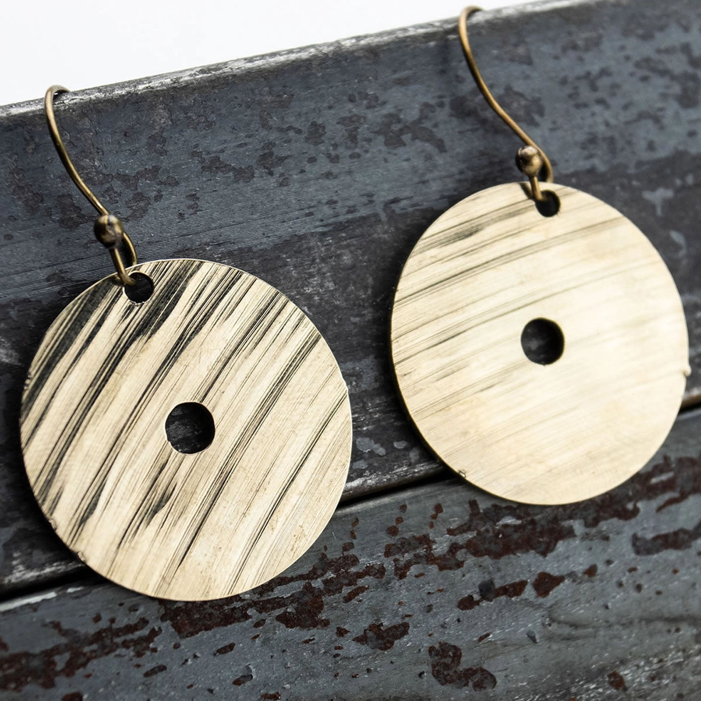 Each earring measures 1" in diameter, balancing simplicity with the rich history of the cymbals they’re made from. Earring hooks are made of an iron-based zinc alloy, and are nickel- and lead-free. As with all pieces from Full Circle Co., every pair is unique, with subtle variations that make each one special.