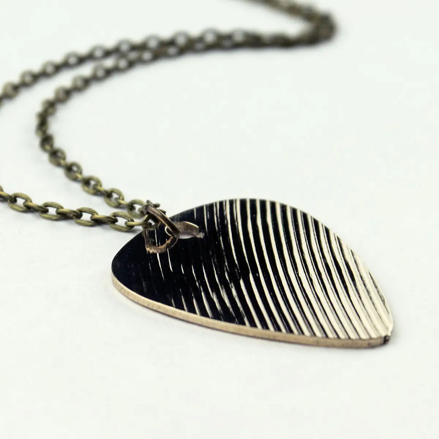 An arpeggio is a broken chord—but in the right hands, it becomes music. Made from a broken cymbal, this guitar pick–shaped pendant turns what was once discarded into something artful and bold. A perfect reminder that beauty can come from imperfection—and that music is everywhere, even in the pieces.