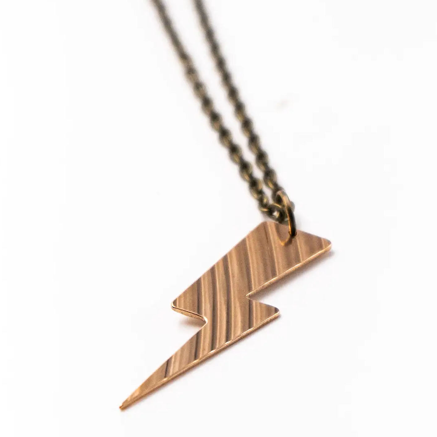 Whether it sparks thoughts of wizardry or wild weather, the Bolt necklace is made for those drawn to energy, power, and a little bit of mischief. Cut from a reclaimed bronze drum cymbal, this striking lightning bolt carries the marks of its musical past and a polished finish that catches the light just right.