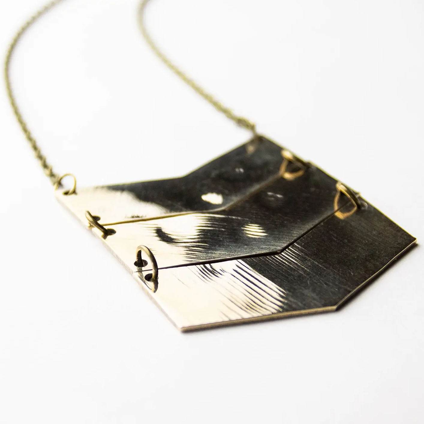 Bold, bright, and beautifully layered, the Chevrons necklace is a statement piece in every sense. Featuring three polished bronze bars cut from reclaimed cymbals, this striking design draws attention while honoring the beauty of broken things. The chevron motif is timeless—sharp, strong, and always in motion.