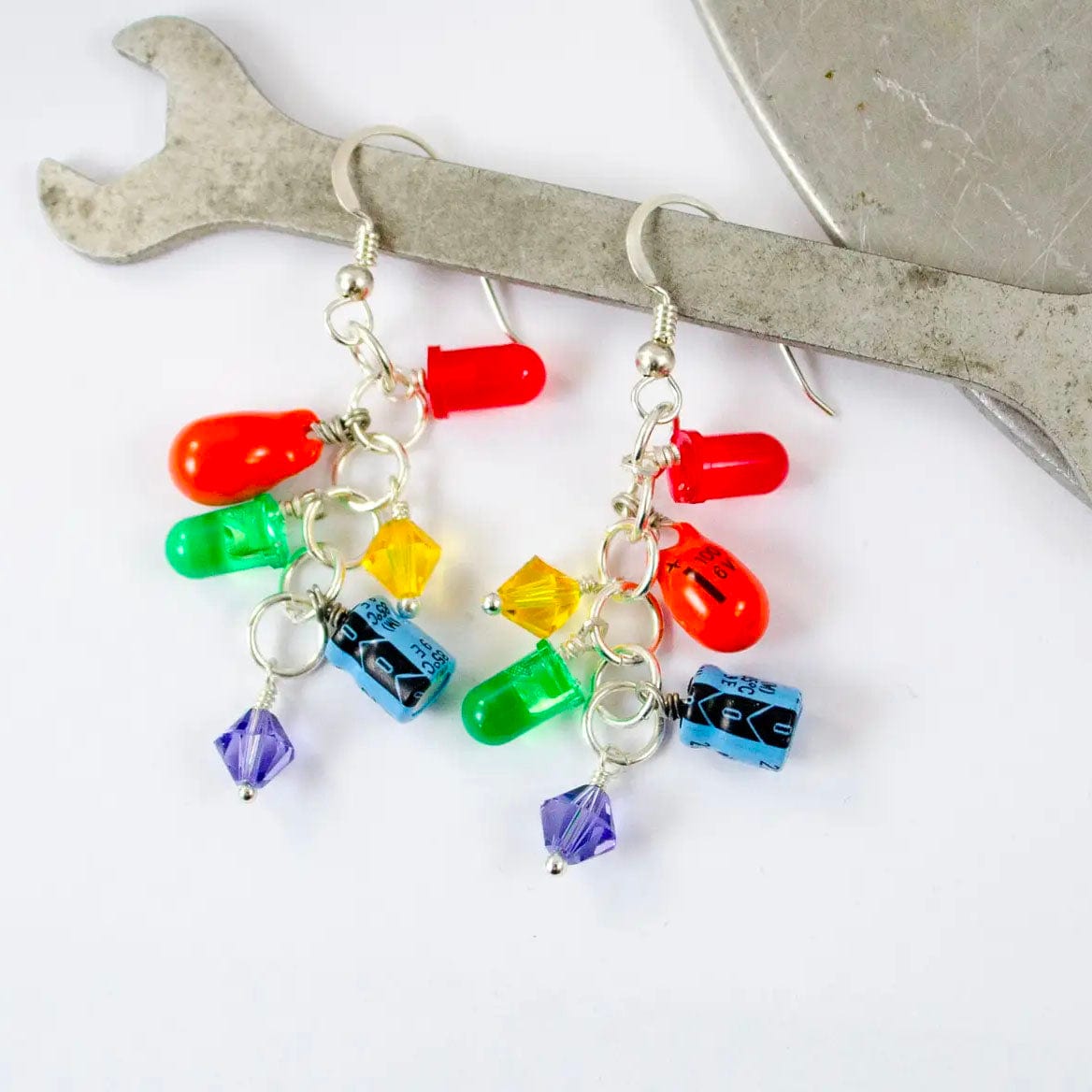 After finding so many fun electronic components in so many colors, Circuit Breaker Labs had to make some rainbows! A variety of components, including LEDS and capacitors, were wire wrapped together to form a rainbow cluster. Swarovski crystal beads fill in to add sparkle. Each earring dangle is 2-1/4 inches (5.5 cm) long from the top of the sterling silver earwire.