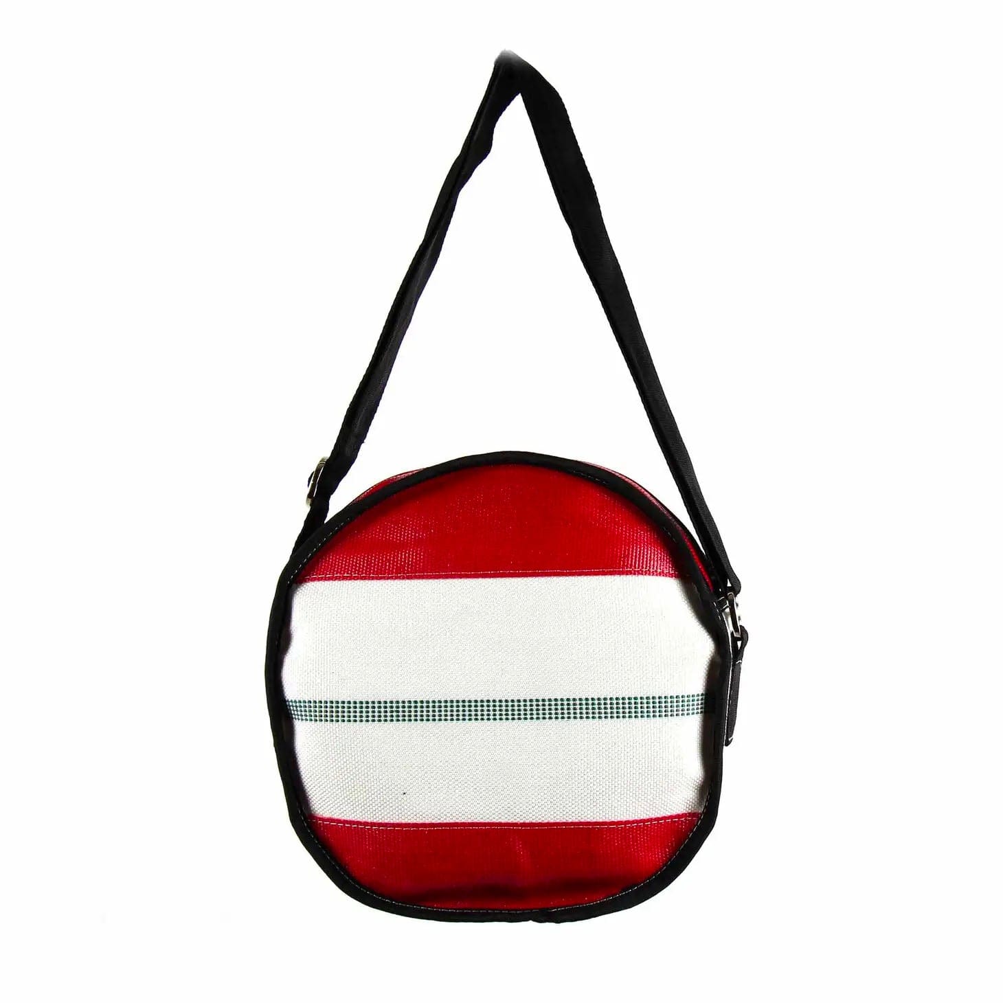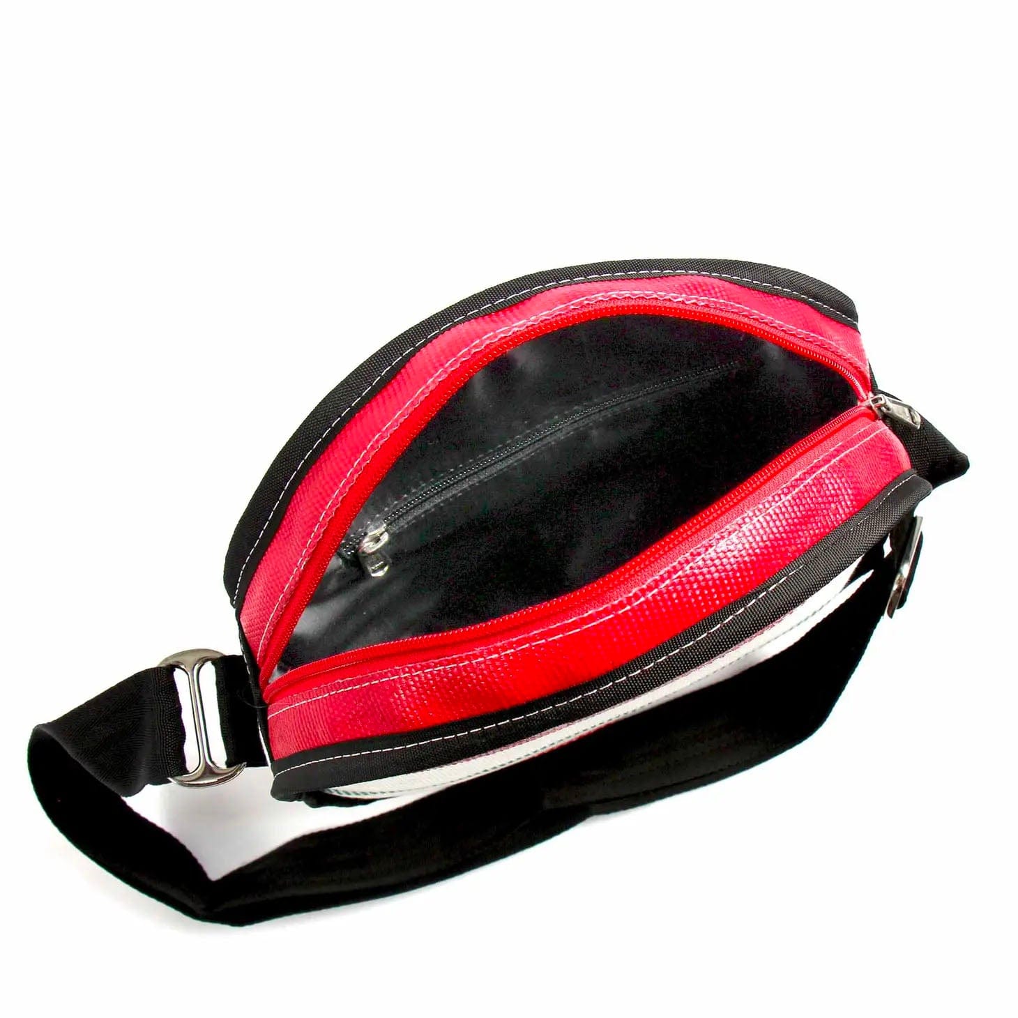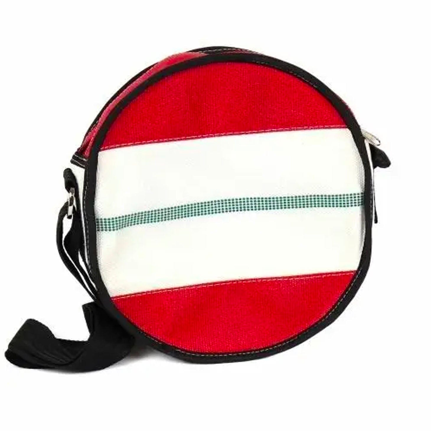 Don't be caught off guard with your gear! This Fire Hose Round Shoulder Bag is the perfect accessory for any adventurer. The body is made of upcycled red rubberized and white fire hose and is sure to keep you looking hot in any situation. With a large zippered pocket and smaller open pocket, you'll have everything you need within reach. Get ready for a wild ride!