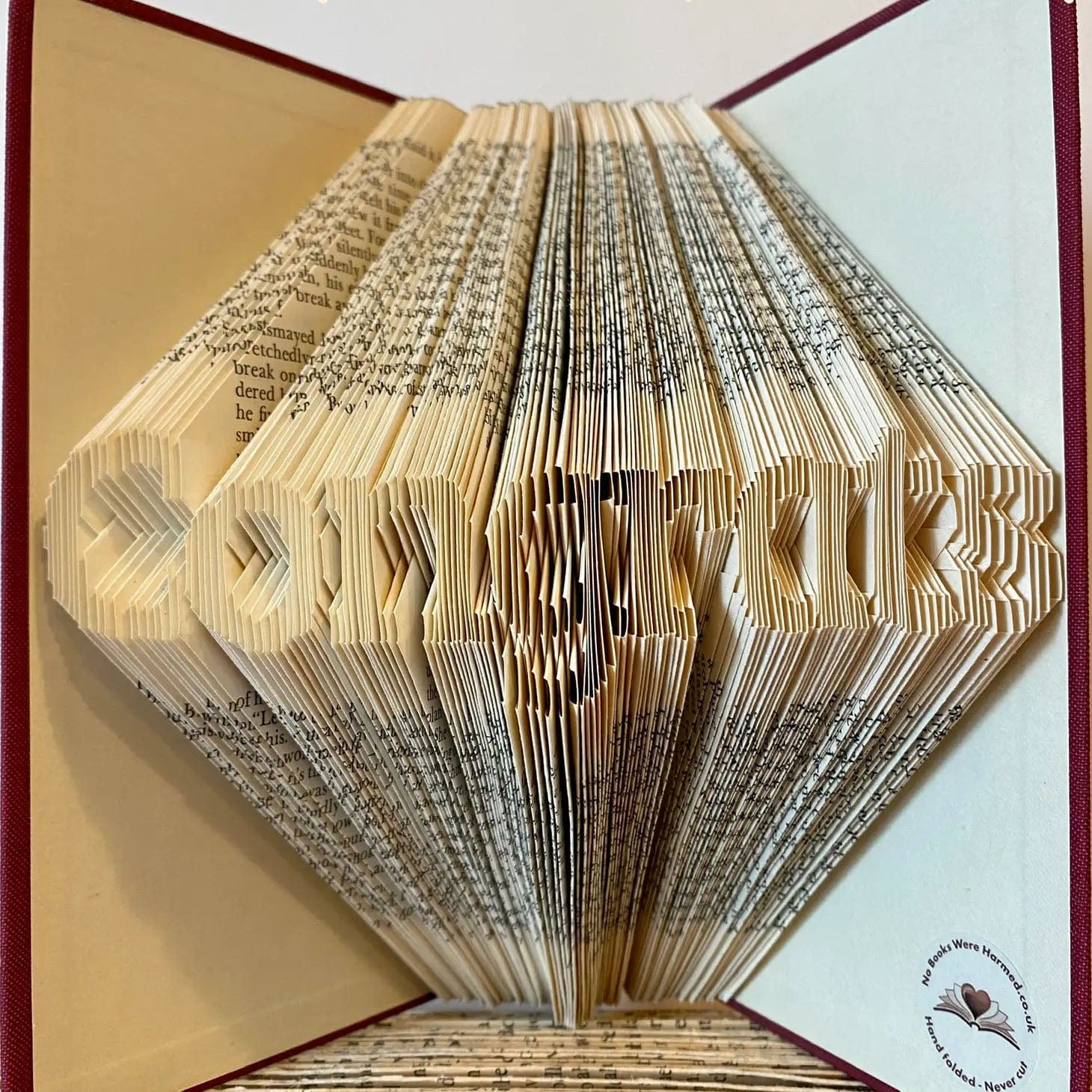 The fast folding fingers of No Books Were Harmed belong to Jo who describes herself as a self taught, full-time designer/maker of no-cut, hand folded, reclaimed book art sculpture. Jo, who lives in Mosstodloch in the northeast of Scotland, is a one-woman show, so if you buy folded book art from Repurposed, she is the one who did the folding.