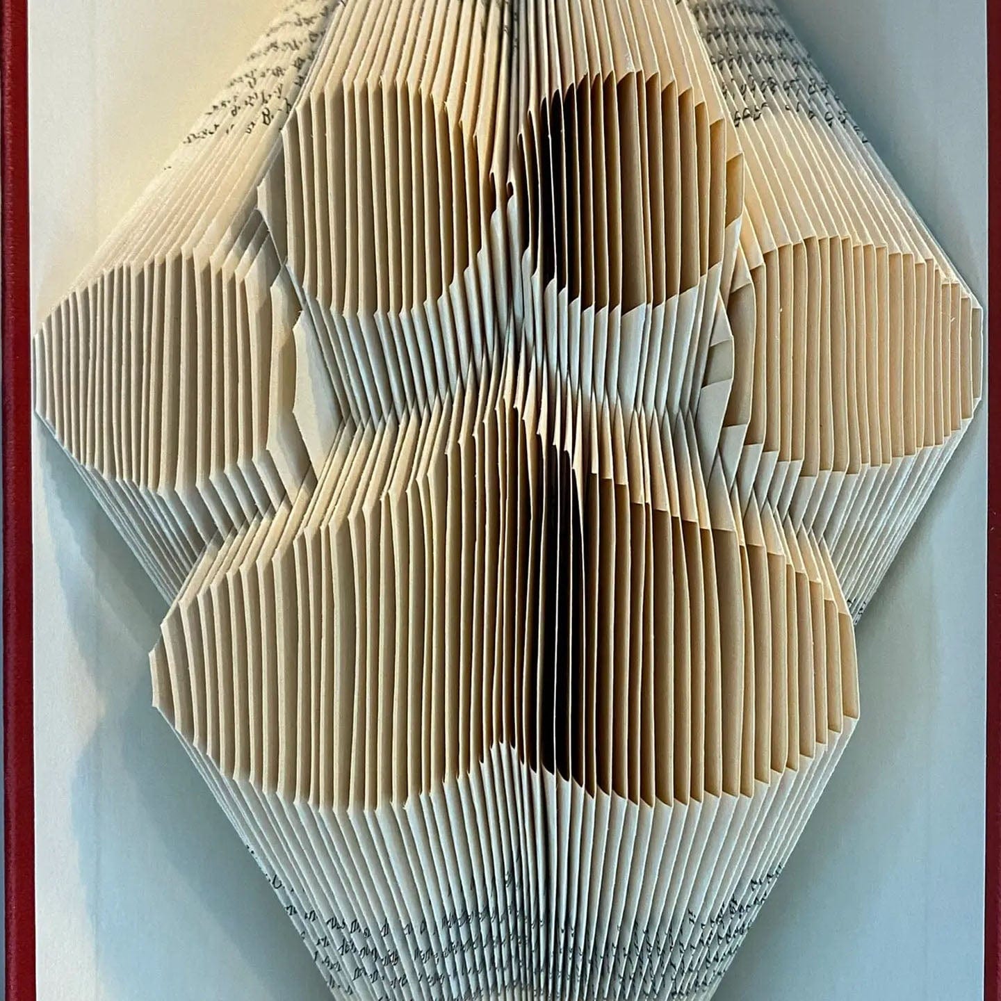 Perfect for animal lovers, this folded book sculpture forms a pet paw with a heart as the center pad. A sweet and playful way to celebrate furry friends, ideal for shelves, desks, or any nook that honors a beloved pet. Display either end up.