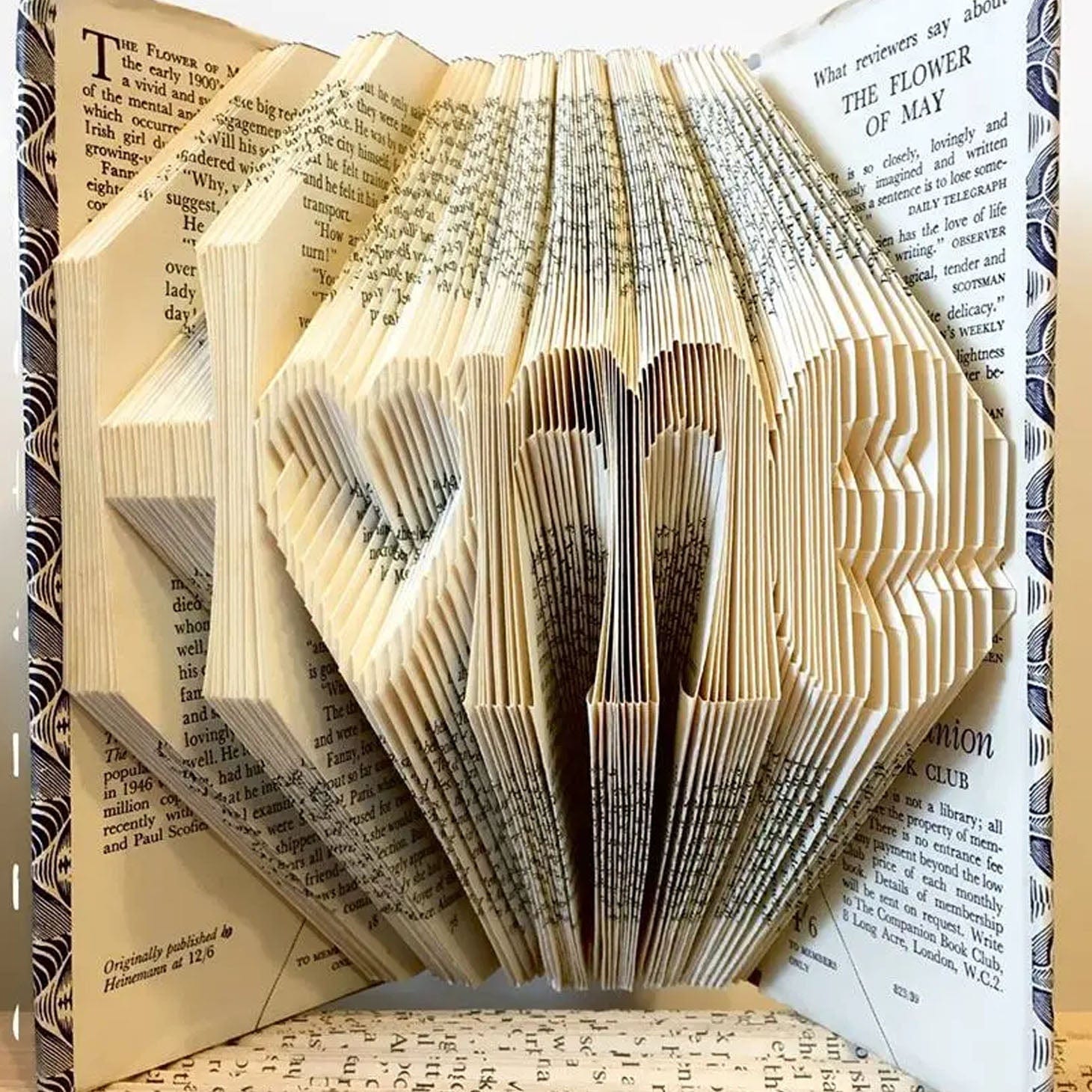 Bring a little warmth to any room with this charming folded book sculpture that spells H♥ME. Each delicate fold transforms a vintage hardcover into a unique statement piece, perfectly capturing the feeling that home is where the heart is. Ideal for mantels, bookshelves, or as a thoughtful gift, this design celebrates comfort, love, and the small joys that make a house a home.