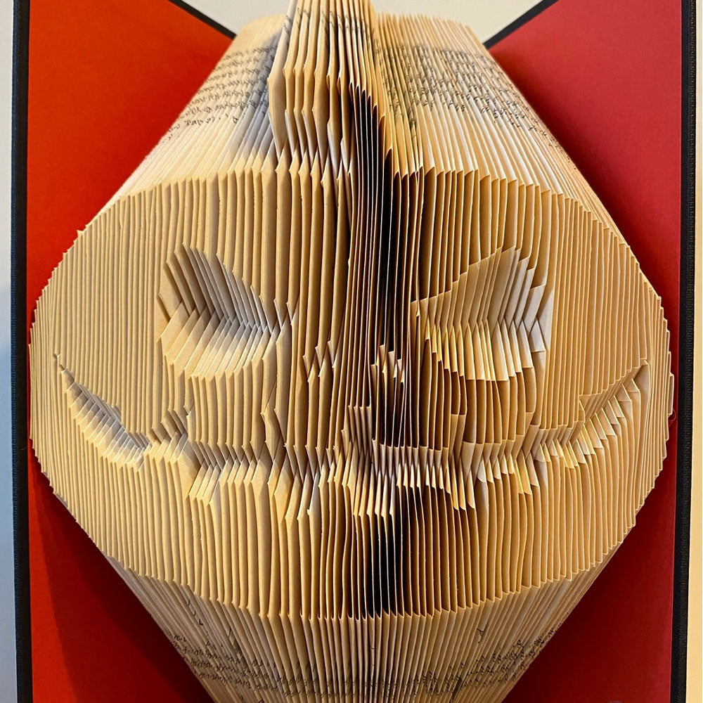 Spooky, playful, and full of character, this folded book sculpture forms a Jack O’Lantern from carefully folded pages. A festive touch for Halloween décor that brings a wink of mischief to any shelf, mantel, or nook.