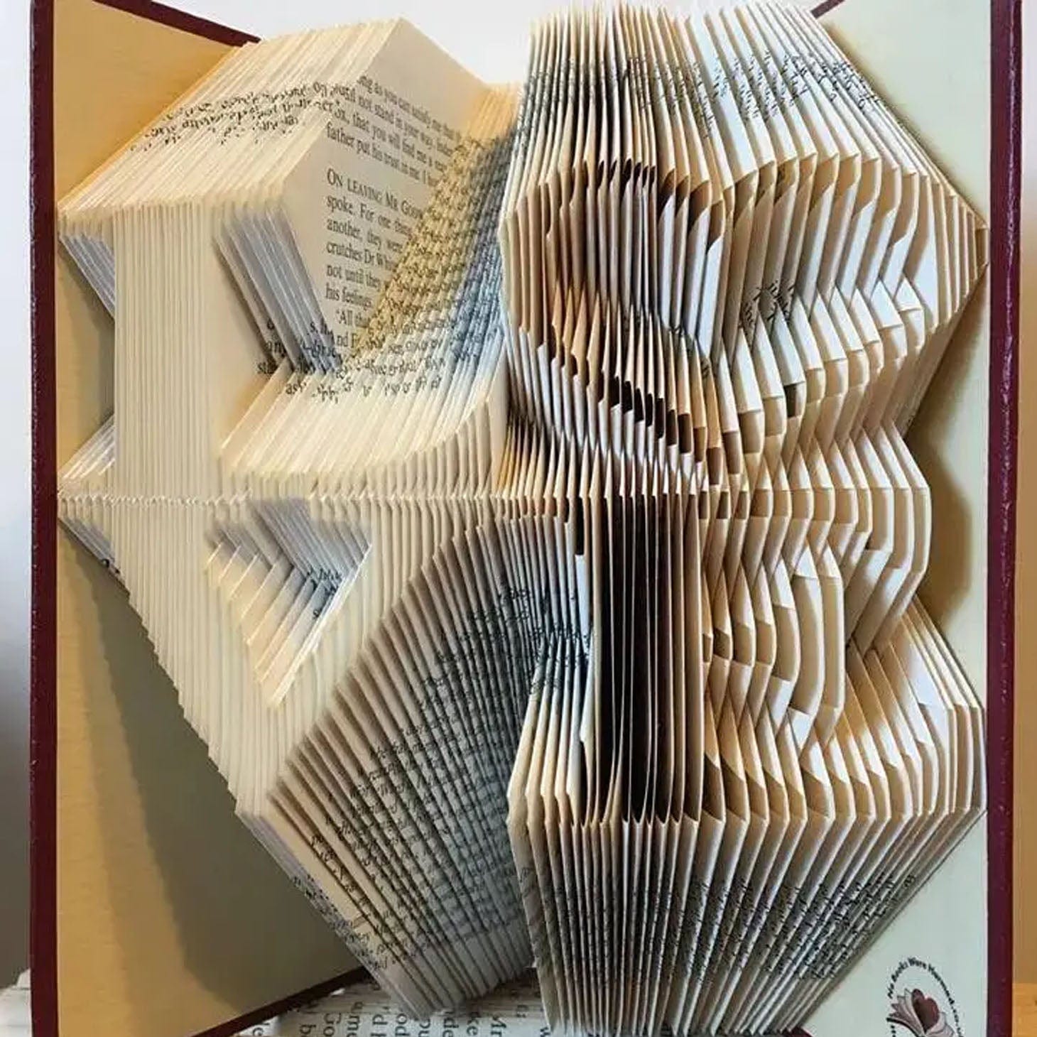 A creative take on a classic word, this folded book sculpture spells “L♥VE” with the “O” replaced by an open heart. Arranged in a square, the “L♥” sits above the “VE,” making a charming, eye-catching display for shelves, desks, or any space that could use a little love.