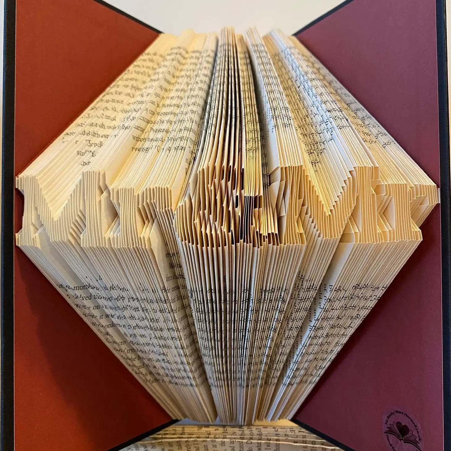 No Books Were Harmed creates every piece of their book art sculptures by making hundreds—or thousands!—of careful folds within the pages of reclaimed, preowned, and vintage hardcover books. It's all folded. Nothing you see has been cut, torn, or otherwise "trickified!"