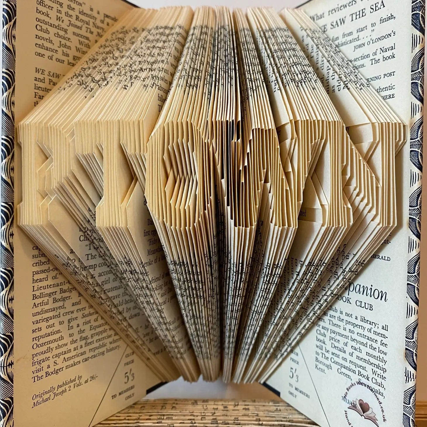 The fast folding fingers of No Books Were Harmed belong to Jo who describes herself as a self taught, full-time designer/maker of no-cut, hand folded, reclaimed book art sculpture. Jo, who lives in Mosstodloch in the northeast of Scotland, is a one-woman show, so if you buy folded book art from Repurposed, she is the one who did the folding.