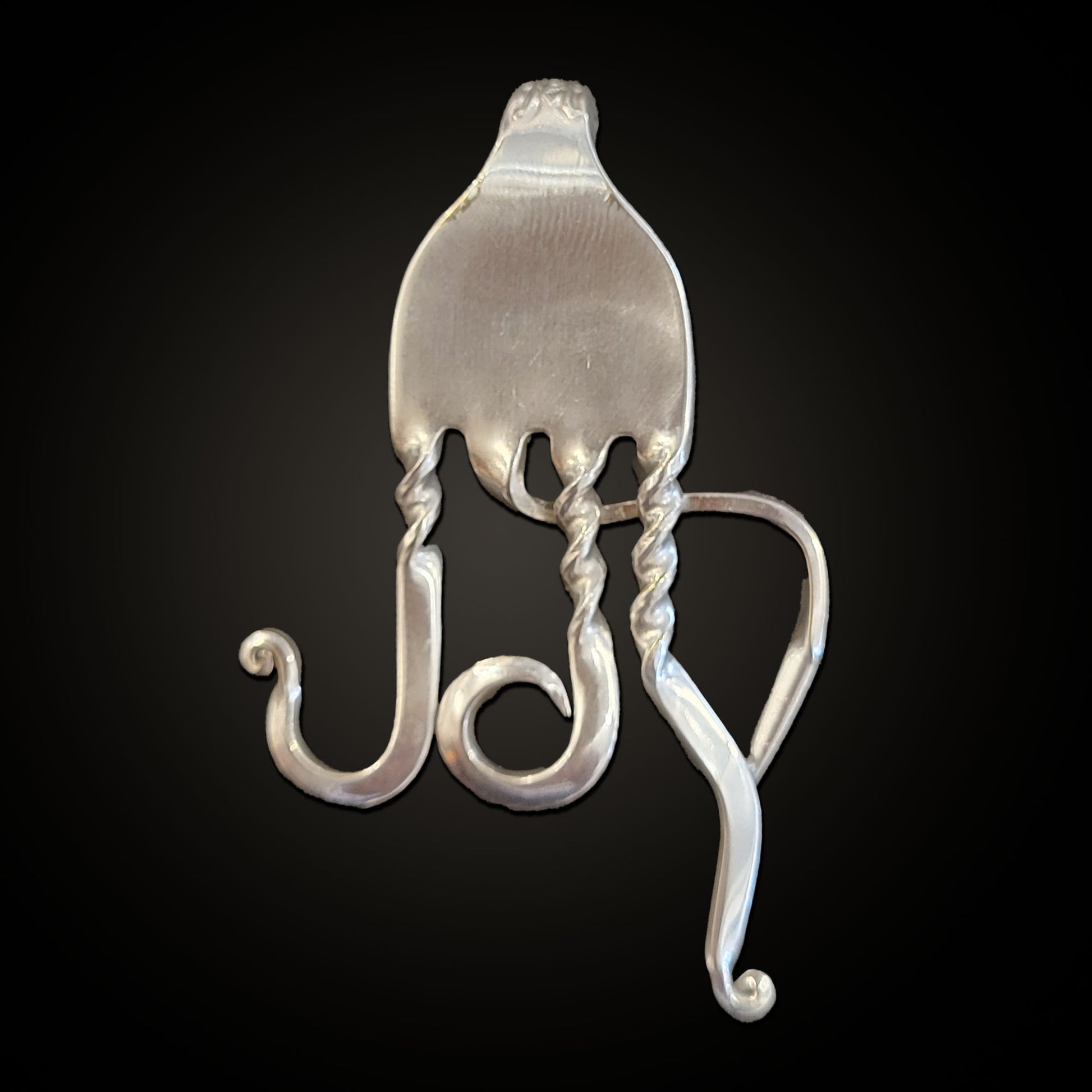 Leave it to John Marchello to take a humble silver-plated fork and turn it into pure Joy. This necklace features a long-tined fork, artfully transformed into the word itself, balanced between industrial edge and playful spirit. It comes on your choice of a 24” ball chain or an 18” silken cord.