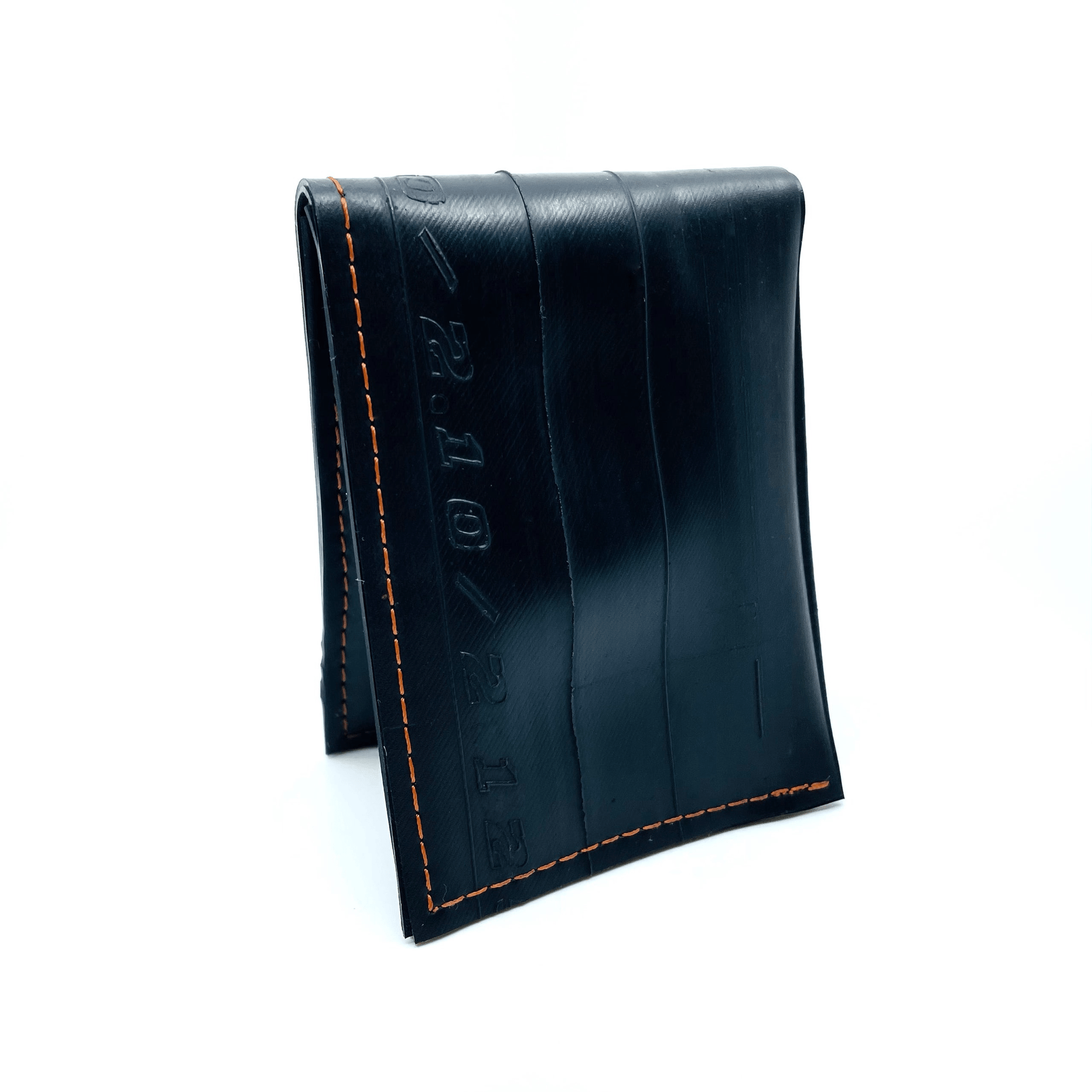 This traditional bifold wallet has one main compartment large enough for your bills and receipts, along with four visible slots and two hidden pockets that collectively can hold up to 20 cards. Random color stitching offsets the black rubber and a subtle Up Line brand adorns the front. Because these are made from recycled tire tubes, your wallet may have printing or other reminders of the material's original purpose, but that just adds to the uniqueness of each piece.