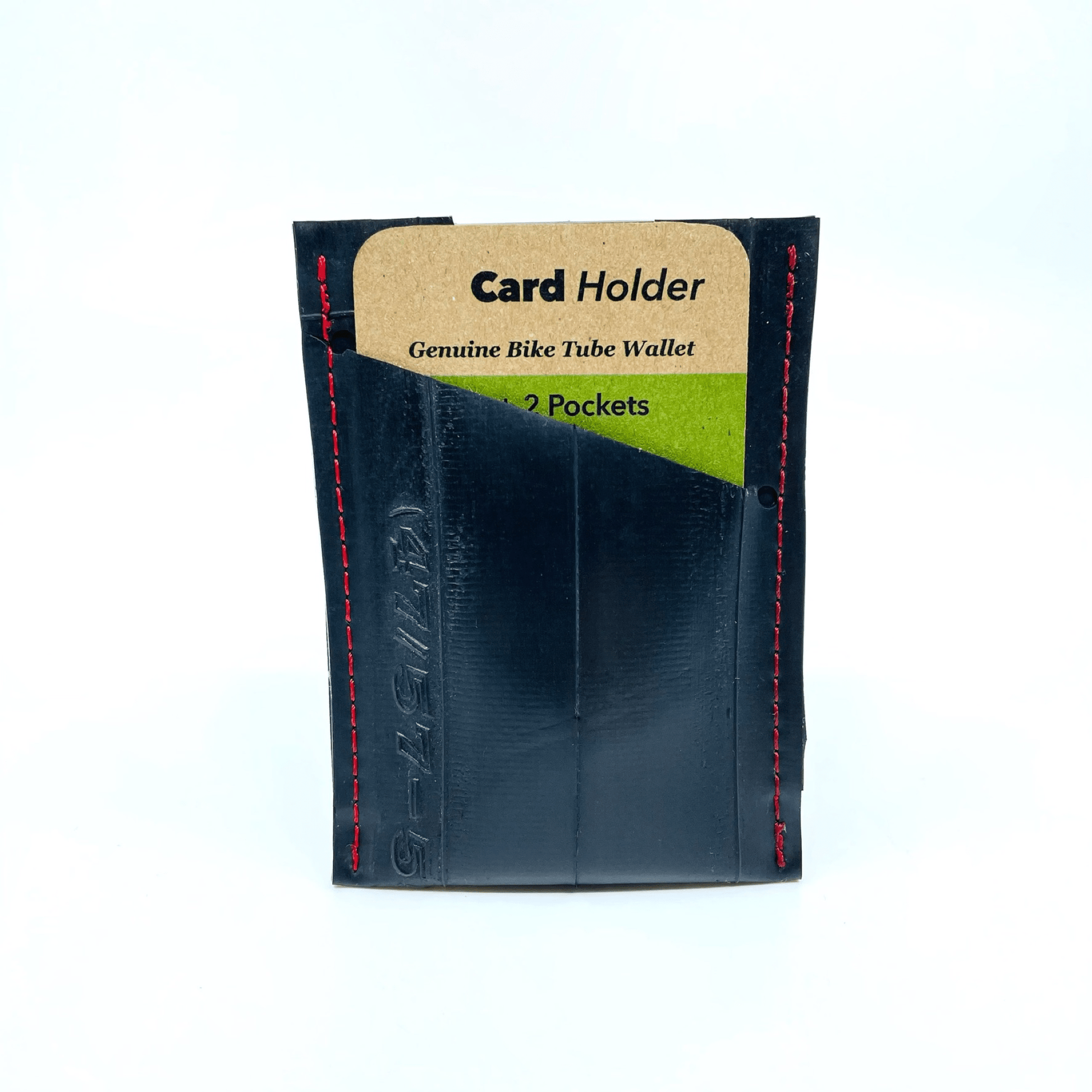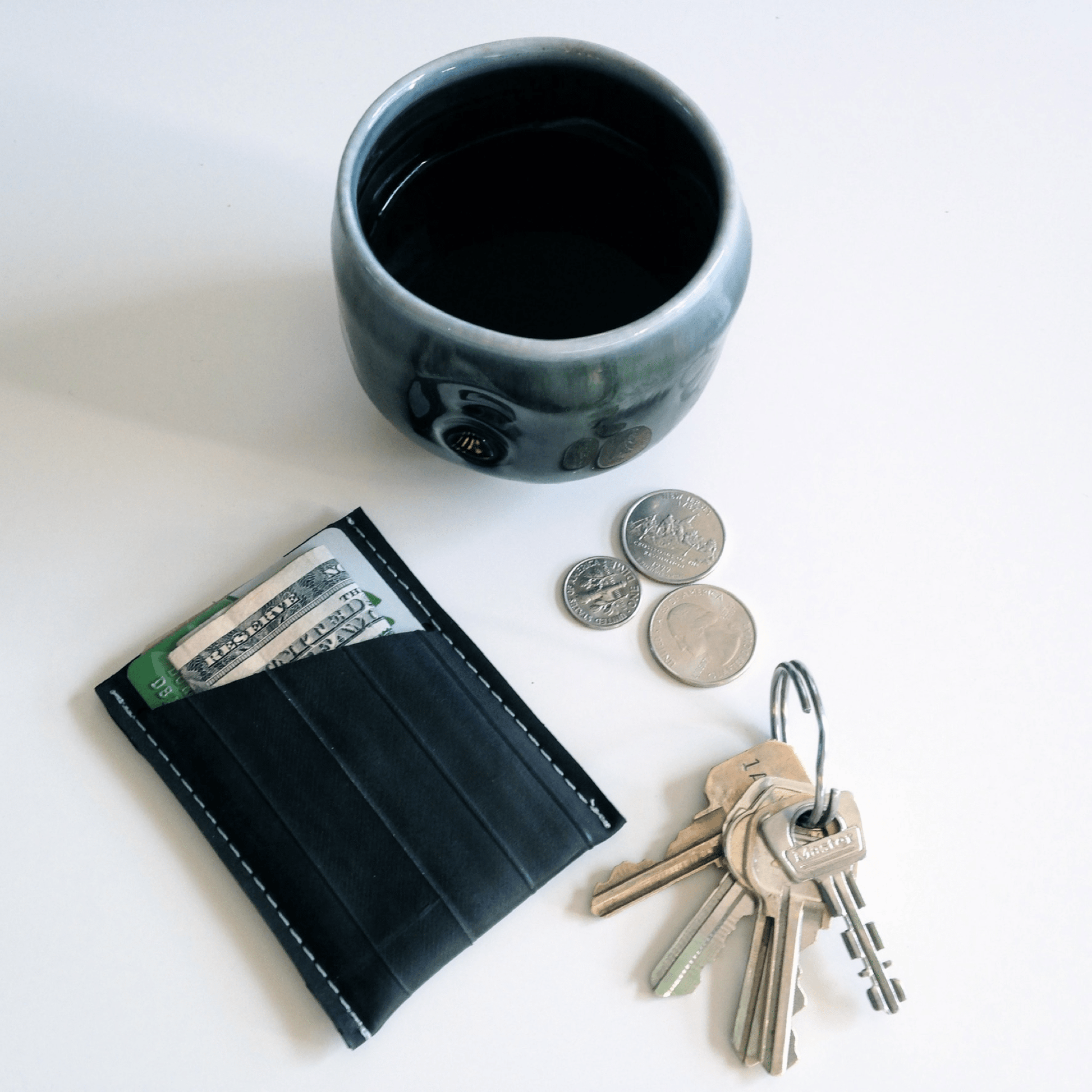 Perfect for the minimalist, this wallet is simply two pockets, each with a card slot cut on the diagonal for ease of use. Identical front and back, it holds up to 10 cards with room for a couple of folded $20 bills slid into a card slot. Random color stitching offsets the black rubber and a subtle Up Line brand adorns the front. Because these are made from recycled tire tubes, your wallet may have printing or other reminders of the material's original purpose, but that just adds to the uniqueness of each piece.