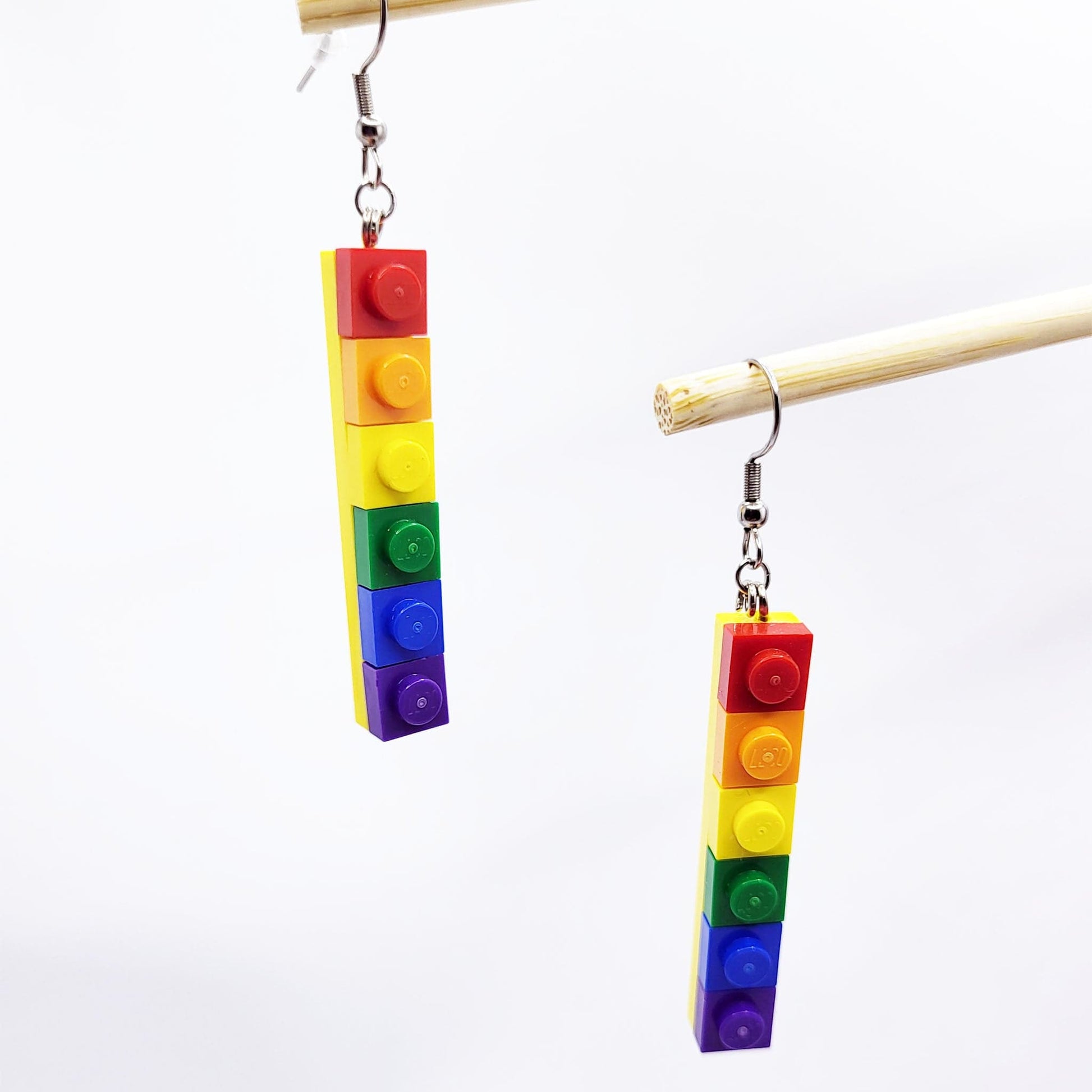 Show your pride with these Lego earrings. A yellow 1x6 Lego plate holds six 1x1 plates in rainbow colors. Crafted from real Lego pieces, these earrings are a unique way to express yourself.